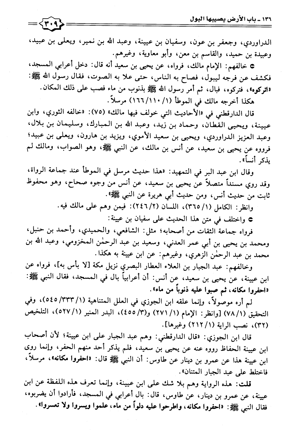 • خالفهم: الإمام مالك، فرواه، عن يحيى بن سعيد أنه قال: دخل أعرابي المسجد، فكشف عن فرجه ليبول، فصاح به الناس، حتى علا به الصوت، فقال رسول الله - صلى الله عليه وسلم -: "اتركوه"، فتركوه، فبال، ثم أمر رسول الله - صلى الله عليه وسلم - بذنوب من ماء فصب على ذلك المكان.