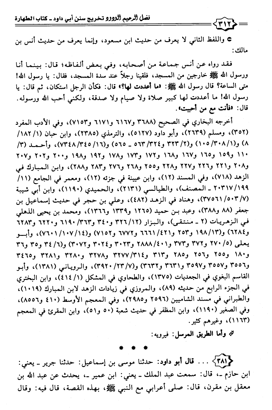 ٣٨١ - . . . قال أبو داود: حدثنا موسى بن إسماعيل: حدثنا جرير -يعني: ابن حازم-، قال: سمعت عبد الملك -يعني: ابن عمير-، يحدث عن عبد الله بن معقل بن مقرن، قال: صلى أعرابي مع النبي - صلى الله عليه وسلم -، بهذه القصة، قال فيه: وقال