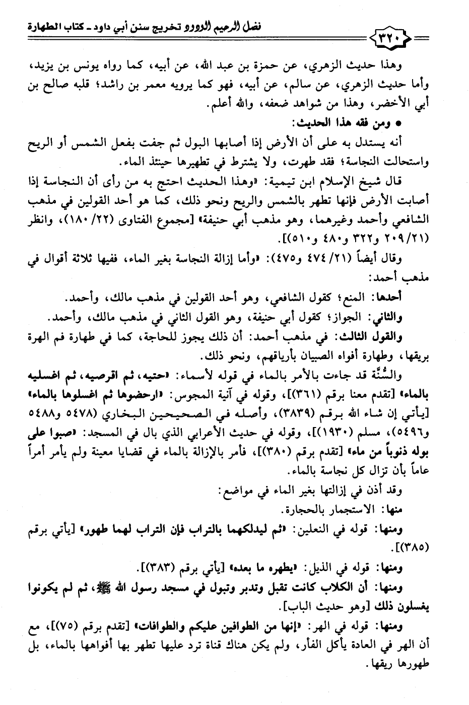 قال شيخ الإسلام ابن تيمية: "وهذا الحديث احتج به من رأى أن النجاسة إذا أصابت الأرض فإنها تطهر بالشمس والريح ونحو ذلك، كما هو أحد القولين في مذهب الشافعي وأحمد وغيرهما، وهو مذهب أبي حنيفة" [مجموع الفتاوى (٢٢/ ١٨٠)، وانظر (٢١/ ٢٠٩ و ٣٢٢ و ٤٨٠ و ٥١٠)].