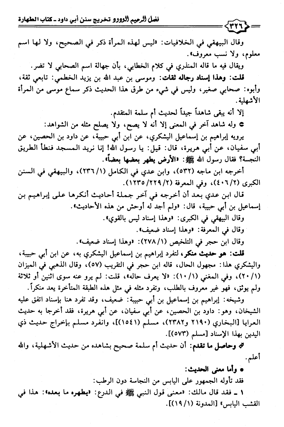 يرويه إبراهيم بن إسماعيل اليشكري، عن ابن أبي حبيبة، عن داود بن الحصين، عن أبي سفيان، عن أبي هريرة، قال: قيل: يا رسول الله! إنا نريد المسجد فنطأ الطريق النجسة؟ فقال رسول الله - صلى الله عليه وسلم -: "الأرض يطهر بعضها بعضًا".