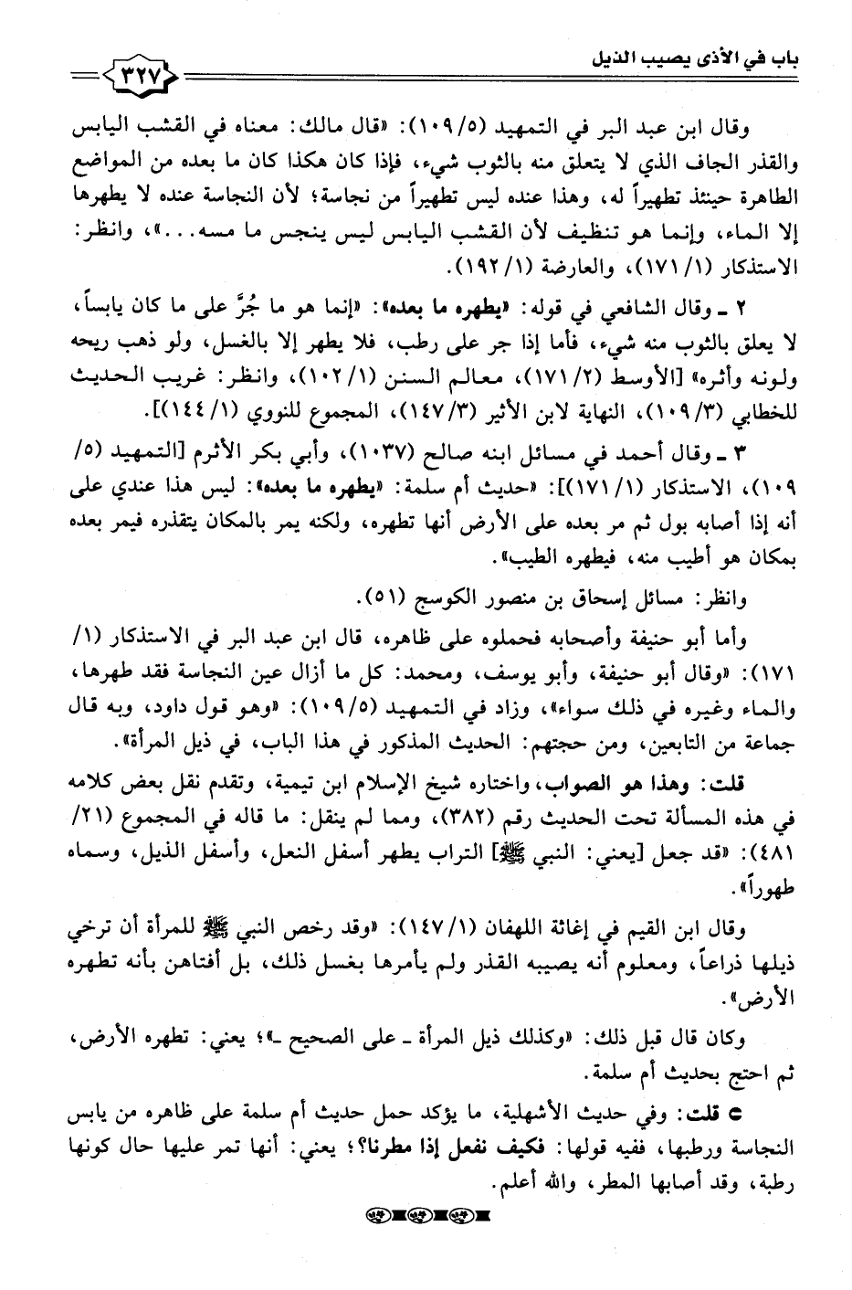 • قلت: وفي حديث الأشهلية، ما يؤكد حمل حديث أم سلمة على ظاهره من يابس النجاسة ورطبها، ففيه قولها: فكيف نفعل إذا مطرنا؟؛ يعني: أنها تمر عليها حال كونها رطبة، وقد أصابها المطر، والله أعلم.