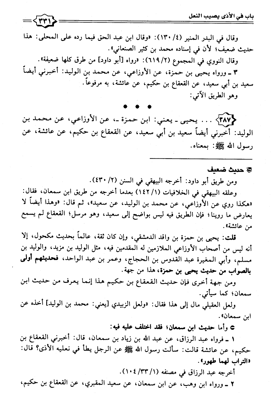 ١ - فرواه عبد الرزاق، عن عبد الله بن زياد بن سمعان، قال: أخبرني القعقاع بن حكيم، عن عائشة قالت: سألت رسول الله - صلى الله عليه وسلم - عن الرجل يطأ في نعليه الأذى؟ قال: "التراب لهما طهور".