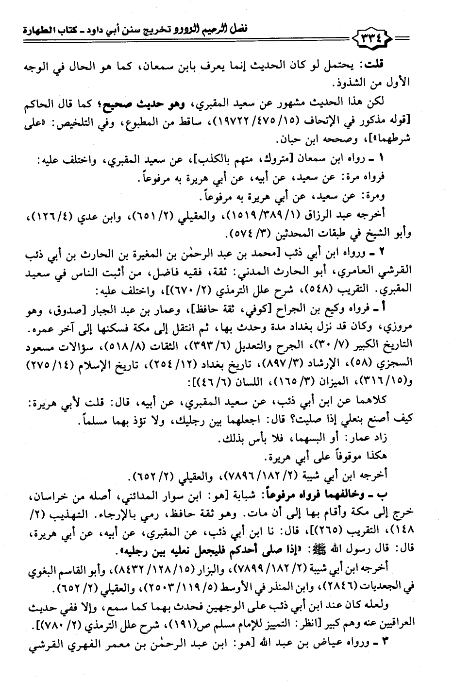 ب- وخالفهما فرواه. مرفوعًا: شبابة [هو: ابن سوار المدائني، أصله من خراسان، خرج إلى مكة وأقام بها إلى أن مات. وهو ثقة حافظ، رمي بالإرجاء. التهذيب (٢/ ١٤٨)، التقريب (٢٦٥)]، قال: نا ابن أبي ذئب، عن المقبري، عن أبيه، عن أبي هريرة، قال: قال رسول الله - صلى الله عليه وسلم -: "إذا صلى أحدكم فليجعل نعليه بين رجليه".