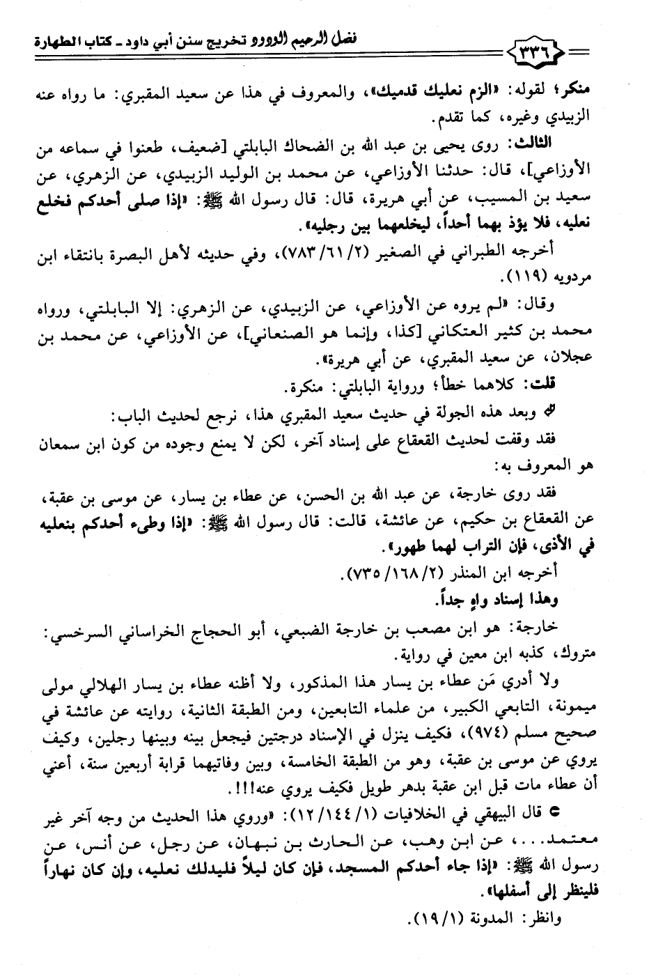 الثالث: روى يحيى بن عبد الله بن الضحاك البابلتي [ضعيف، طعنوا في سماعه من الأوزاعي]، قال: حدثنا الأوزاعي، عن محمد بن الوليد الزبيدي، عن الزهري، عن سعيد بن المسيب، عن أبي هريرة، قال: قال رسول الله - صلى الله عليه وسلم -: "إذا صلى أحدكم فخلع نعليه، فلا يؤذ بهما أحدًا، ليخلعهما بين رجليه".