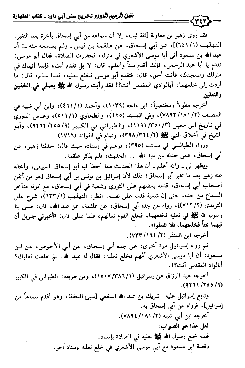 ثم رواه إسرائيل مرة أخرى، عن جده أبي إسحاق، عن أبي الأحوص، عن ابن مسعود: أن أبا موسى الأشعري أمَّهم فخلع نعليه، فقال له عبد الله: لم خلعت نعليك؟ أبالواد المقدس أنت؟!.