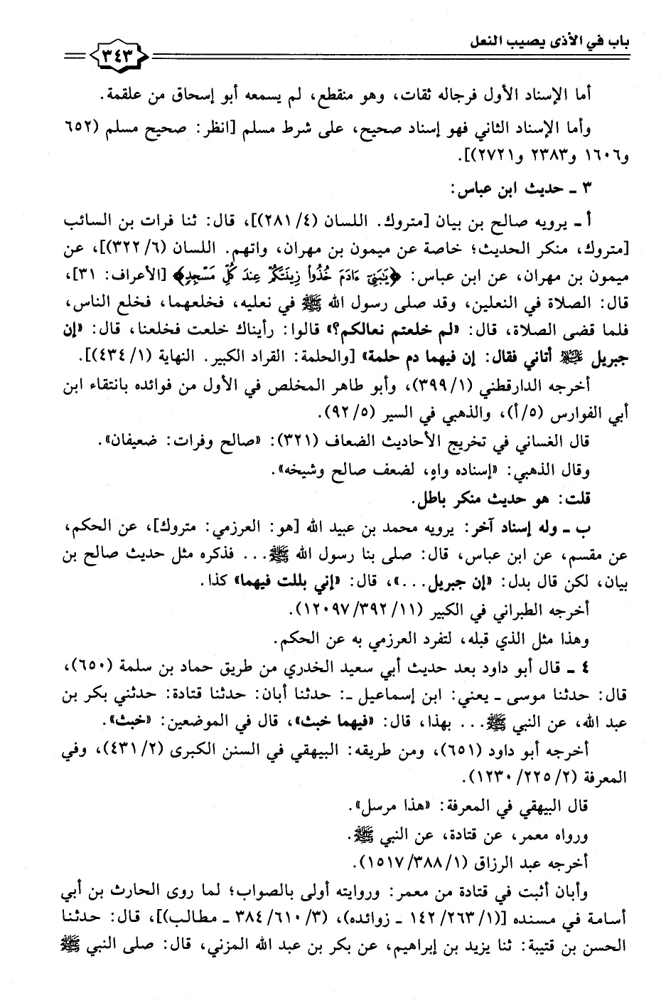 أ- يرويه صالح بن بيان [متروك. اللسان (٤/ ٢٨١)]، قال: ثنا فرات بن السائب [متروك، منكر الحديث؛ خاصة عن ميمون بن مهران، واتهم. اللسان (٦/ ٣٢٢)]، عن ميمون بن مهران، عن ابن عباس: {يَابَنِي آدَمَ خُذُوا زِينَتَكُمْ عِنْدَ كُلِّ مَسْجِدٍ} [الأعراف: ٣١]، قال: الصلاة في النعلين، وقد صلى رسول الله - صلى الله عليه وسلم - في نعليه، فخلعهما، فخلع الناس، فلما قضى الصلاة، قال: "لم خلعتم نعالكم؟ " قالوا: رأيناك خلعت فخلعنا، قال: "إن جبربل - رضي الله عنه - أتاني فقال: إن فيهما دم حلمة" [والحلمة: القراد الكبير. النهاية (١/ ٤٣٤)].