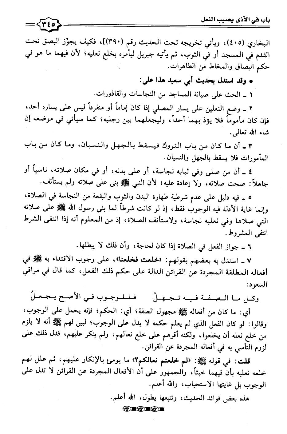 قلت: في قوله - صلى الله عليه وسلم -: "لم خلعتم نعالكم؟ " ما يومئ بالإنكار عليهم، ثم علل لهم خلعه نعليه بأن فيهما خبثًا، والجمهور على أن الأفعال المجردة عن القرائن لا تدل على الوجوب بل غايتها الاستحباب، والله أعلم.