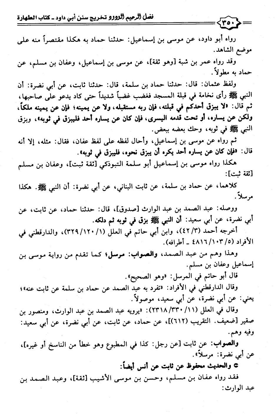 ولفظ عثمان: قال: حدثنا حماد بن سلمة، قال: حدثنا ثابت، عن أبي نضرة: أن النبي - صلى الله عليه وسلم - رأى نخامة في قبلة المسجد فغضب غضبًا شديدًا حتى كاد يدعو على صاحبها، ثم قال: "لا يبزق أحدكم في قبلته، فإن ربه مستقبله، ولا عن يمينه؛ فإن عن يمينه ملكًا، ولكن عن يساره، أو تحت قدمه اليسرى، فإن كان عن يساره أحد فليبزق في ثوبه"، وبزق النبي - صلى الله عليه وسلم - في ثوبه، وحك بعضه ببعض.