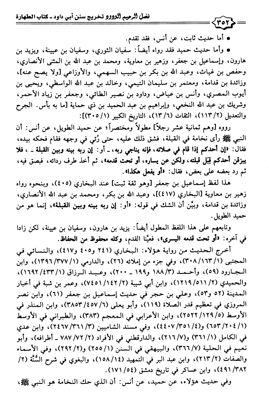 رووه [وهم ثمانية عشر رجلًا]، مطولًا ومختصرًا؛ عن حميد الطويل، عن أنس: أن النبي - صلى الله عليه وسلم - رأى نخامة في القبلة، فشق ذلك عليه، حتى رُئي في وجهه فقام فحكه بيده، فقال: "إن أحدكم إذا قام في صلاته، فإنه يناجي ربه، -أو: إن ربه بينه وبين القبلة-، فلا يبزقن أحدكم قِبَل فبلته، ولكن عن يساره، أو تحت قدمه"، ثم أخذ طرف ردائه، فبصق فيه، ثم رد بعضه على بعض، فقال: "أو يفعل هكذا".