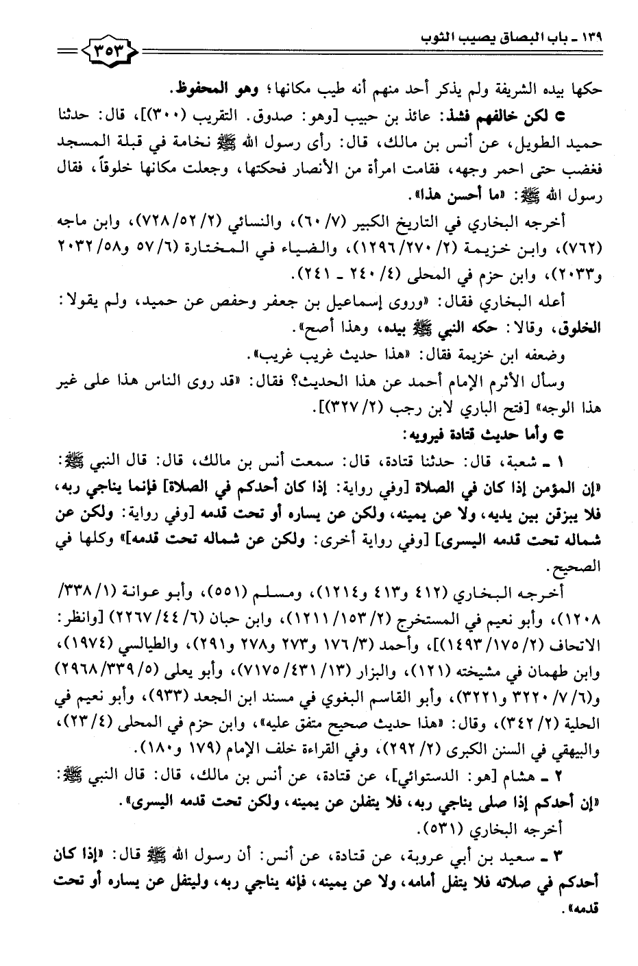 ١ - شعبة، قال: حدثنا قتادة، قال: سمعت أنس بن مالك، قال: قال النبي - صلى الله عليه وسلم -: "إن المؤمن إذا كان في الصلاة [وفي رواية: إذا كان أحدكم في الصلاة] فإنما يناجي ربه، فلا يبزقن بين يديه، ولا عن يمينه، ولكن عن يساره أو تحت قدمه [وفي رواية: ولكن عن شماله تحت قدمه اليسرى] [وفي رواية أخرى: ولكن عن شماله تحت قدمه] " وكلها في الصحيح.