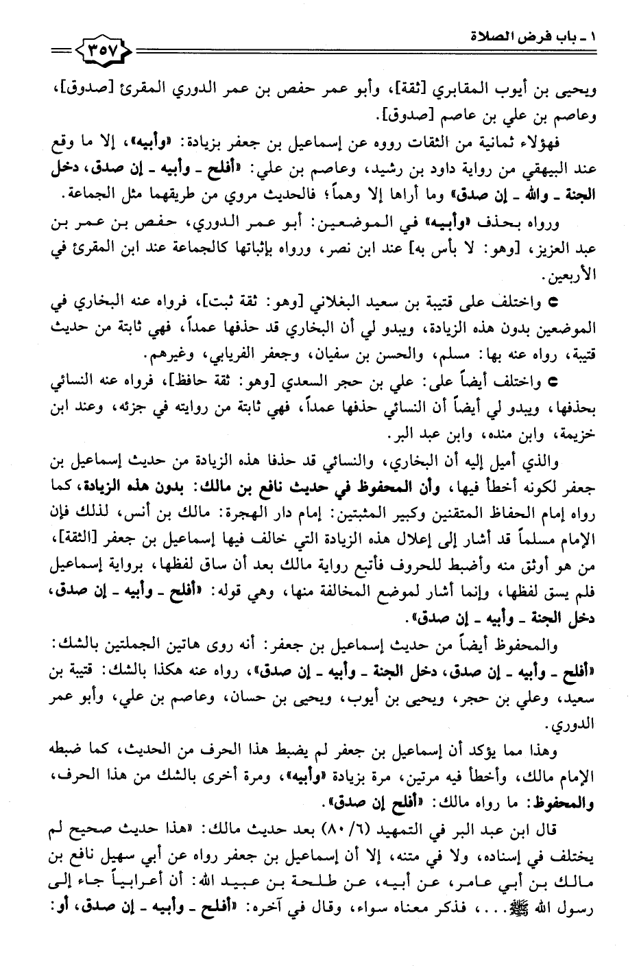 وهذا مما يؤكد أن إسماعيل بن جعفر لم يضبط هذا الحرف من الحديث، كما ضبطه الإمام مالك، وأخطأ فيه مرتين، مرة بزيادة "وأبيه"، ومرة أخرى بالشك من هذا الحرف، والمحفوظ: ما رواه مالك: "أفلح إن صدق".