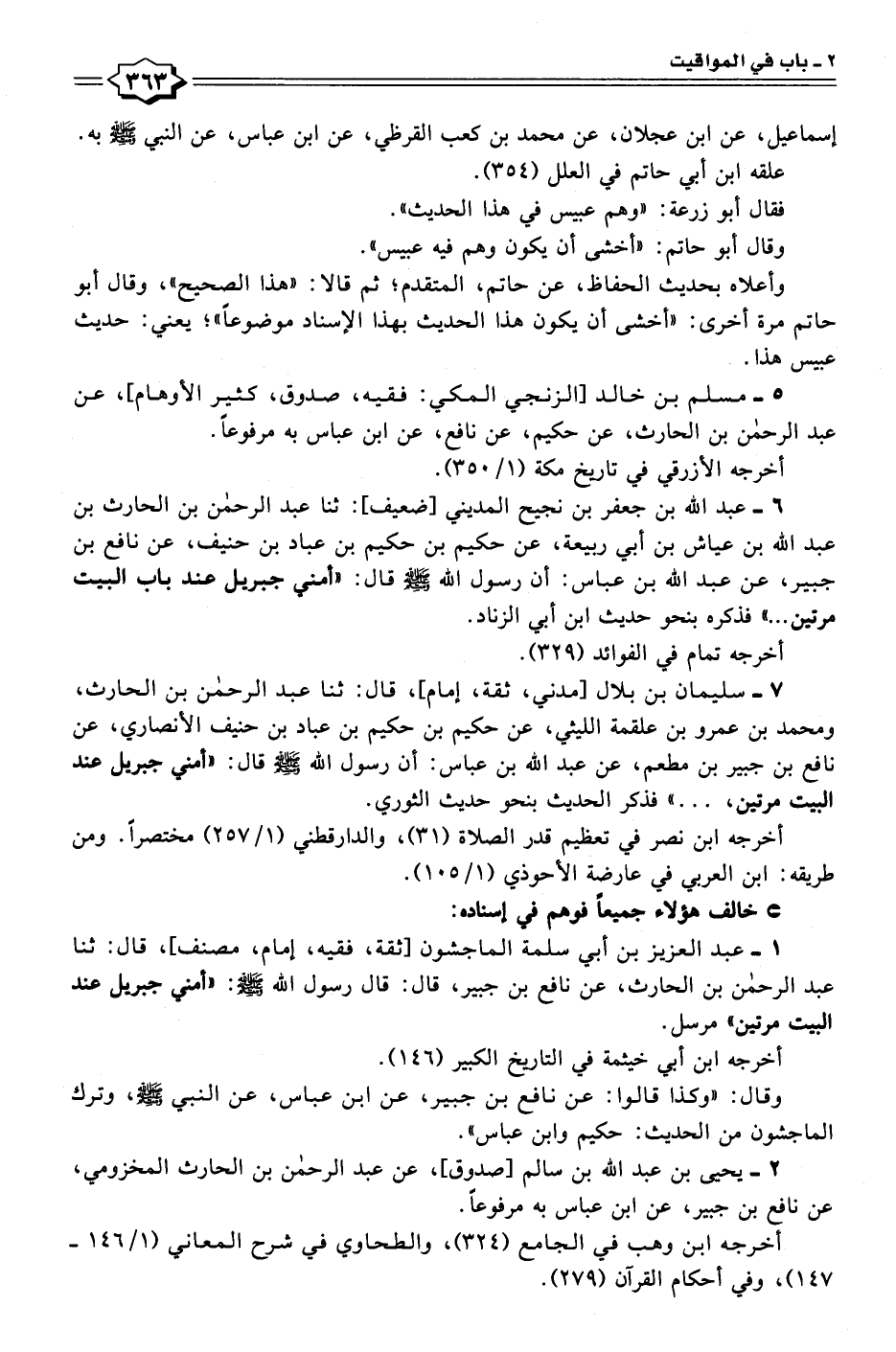 ١ - عبد العزيز بن أبي سلمة الماجشون [ثقة، فقيه، إمام، مصنف]، قال: ثنا عبد الرحمن بن الحارث، عن نافع بن جبير، قال: قال رسول الله - صلى الله عليه وسلم -: "أمني جبريل عند البيت مرتين" مرسل.