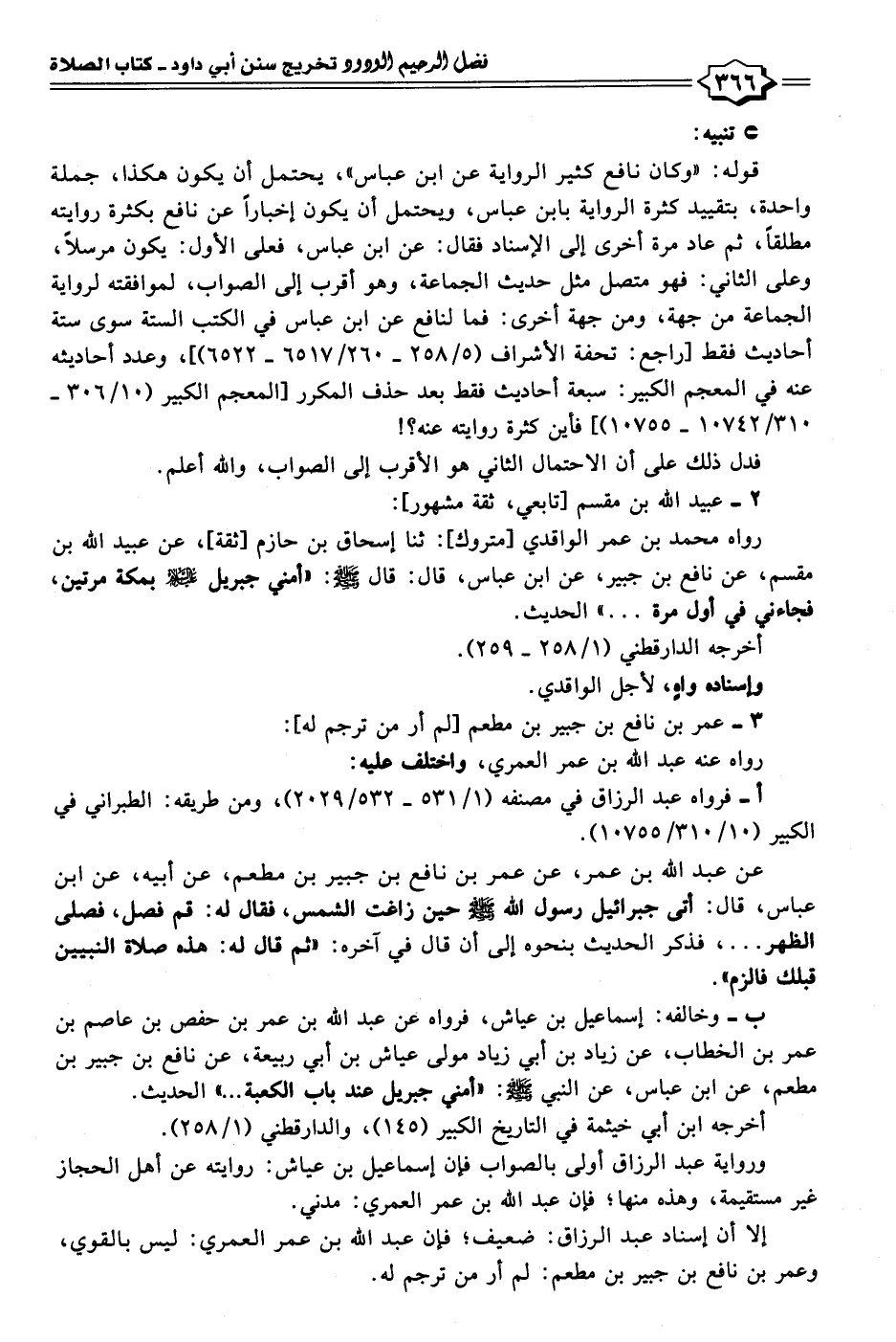 قوله: "وكان نافع كثير الرواية عن ابن عباس"، يحتمل أن يكون هكذا، جملة واحدة، بتقييد كثرة الرواية بابن عباس، ويحتمل أن يكون إخبارًا عن نافع بكثرة روايته مطلقًا، ثم عاد مرة أخرى إلى الإسناد فقال: عن ابن عباس، فعلى الأول: يكون مرسلًا، وعلى الثاني: فهو متصل مثل حديث الجماعة، وهو أقرب إلى الصواب، لموافقته لرواية الجماعة من جهة، ومن جهة أخرى: فما لنافع عن ابن عباس في الكتب الستة سوى ستة أحاديث فقط [راجع: تحفة الأشراف (٥/ ٢٥٨ - ٢٦٠/ ٦٥١٧ - ٦٥٢٢)]، وعدد أحاديثه عنه في المعجم الكبير: سبعة أحاديث فقط بعد حذف المكرر [المعجم الكبير (١٠/ ٣٠٦ - ٣١٠/ ١٠٧٤٢ - ١٠٧٥٥)] فأين كثرة روايته عنه؟!