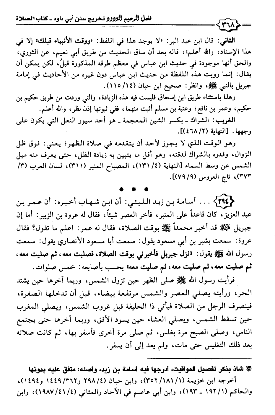 • شاذ بذكر تفصيل المواقيت، أدرجها فيه أسامة بن زيد، وأصله: متفق عليه بدونها.