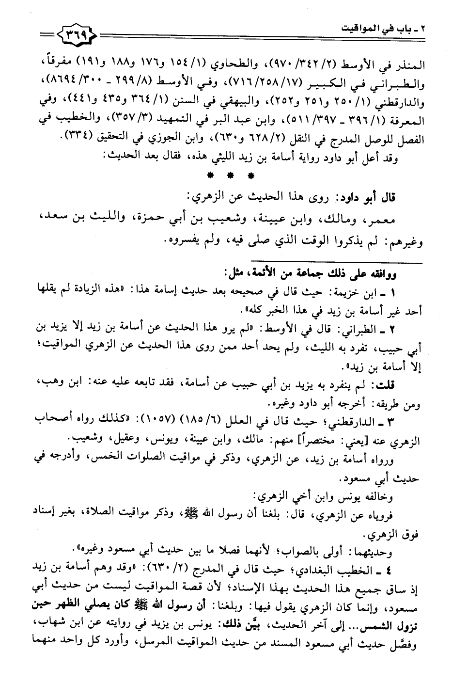 ٢ - الطبراني: قال في الأوسط: "لم يرو هذا الحديث عن أسامة بن زيد إلا يزيد بن أبي حبيب، تفرد به الليث، ولم يحد أحد ممن روى هذا الحديث عن الزهري المواقيت؛ إلا أسامة بن زيد".