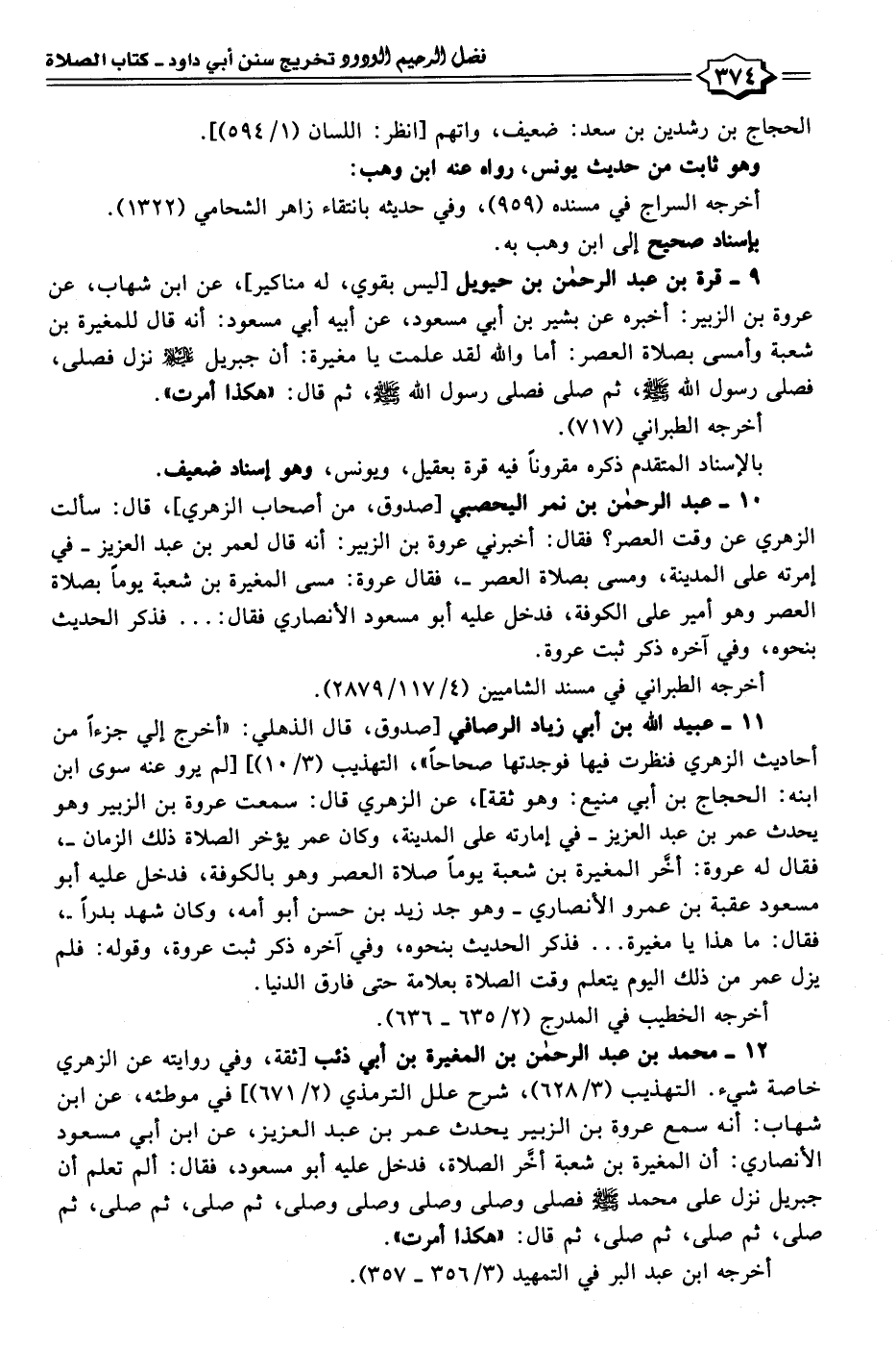 ١٠ - عبد الرحمن بن نمر اليحصبي [صدوق، من أصحاب الزهري]، قال: سألت الزهري عن وقت العصر؟ فقال: أخبرني عروة بن الزبير: أنه قال لعمر بن عبد العزيز -في إمرته على المدينة، ومسى بصلاة العصر-، فقال عروة: مسى المغيرة بن شعبة يومًا بصلاة العصر وهو أمير على الكوفة، فدخل عليه أبو مسعود الأنصاري فقال: ... فذكر الحديث بنحوه، وفي آخره ذكر ثبت عروة.