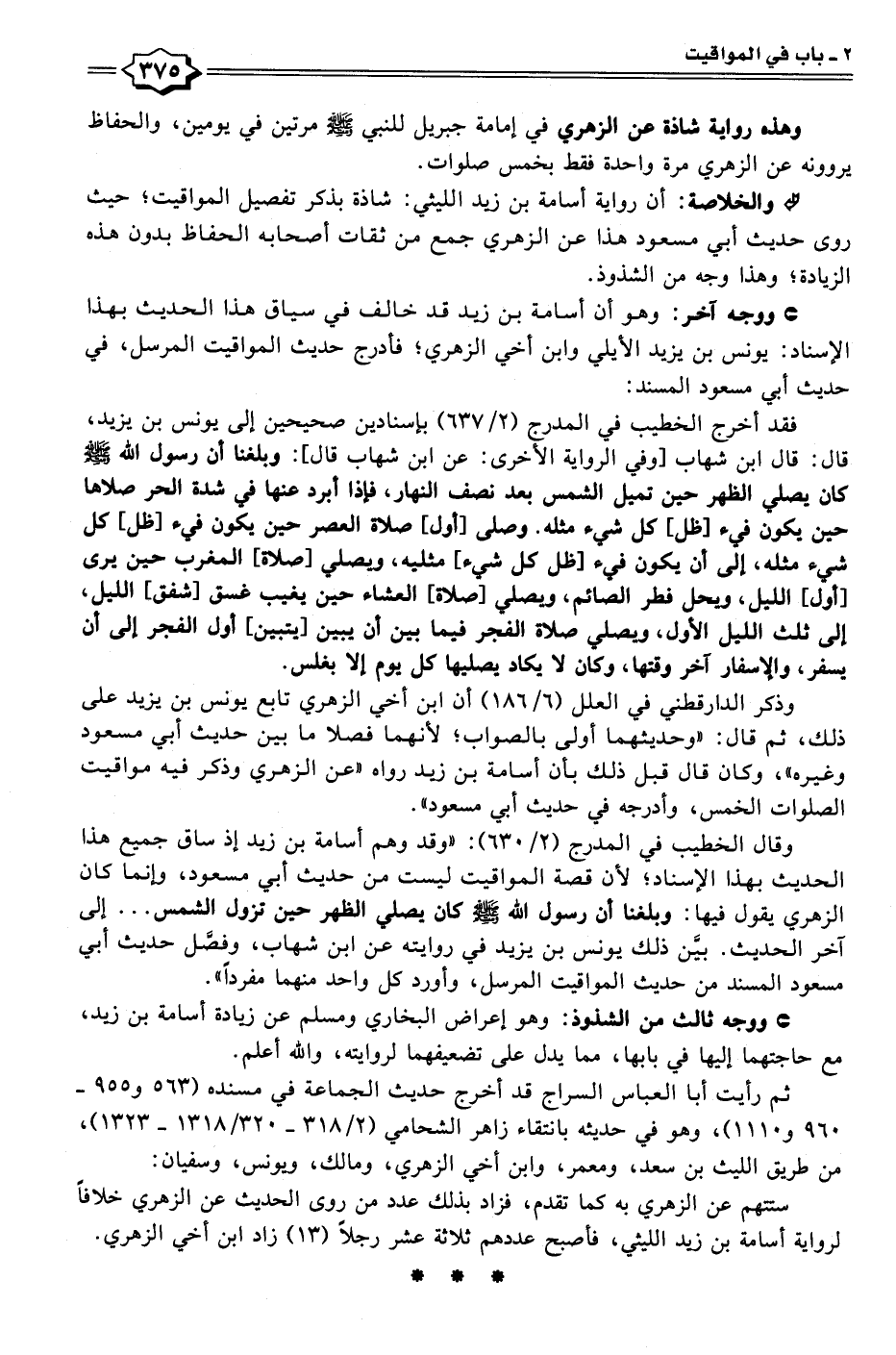 وقال الخطيب في المدرج (٢/ ٦٣٠): "وقد وهم أسامة بن زيد إذ ساق جميع هذا الحديث بهذا الإسناد؛ لأن قصة المواقيت ليست من حديث أبي مسعود، وإنما كان الزهري يقول فيها: وبلغنا أن رسول الله - صلى الله عليه وسلم - كان يصلي الظهر حين تزول الشمس ... إلى آخر الحديث. بيَّن ذلك يونس بن يزيد في روايته عن ابن شهاب، وفصَّل حديث أبي مسعود المسند من حديث المواقيت المرسل، وأورد كل واحد منهما مفردًا".