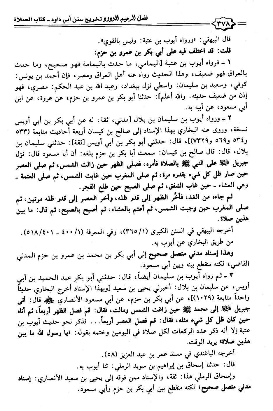 ٢ - ورواه أيوب بن سليمان بن بلال [مدني، ثقة، له عن أبي بكر بن أبي أويس نسخة، وروى عنه البخاري بهذا الإسناد إلى صالح بن كيسان أربعة أحاديث متابعة (٥٣٣ و ٥٣٤ و ٥٦٩ و ٧٣٢٩)،، قال: حدثني أبو بكر بن أبي أويس [ثقة]: حدثني سليمان بن بلال، قال: قال صالح بن كيسان: سمعت أبا بكر بن حزم بلغه: أن أبا مسعود قال: نزل جبريل عليه السلام على النبي - صلى الله عليه وسلم - بالصلاة فأمره، فصلى الظهر حين زالت الشمس، ثم صلى العصر حين صار ظل كل شيء بقدره مرة، ثم صلى المغرب حين غابت الشمس، ثم صلى العتمة -وهي العشاء- حين غاب الشفق، ثم صلى الصبح حين طلع الفجر.