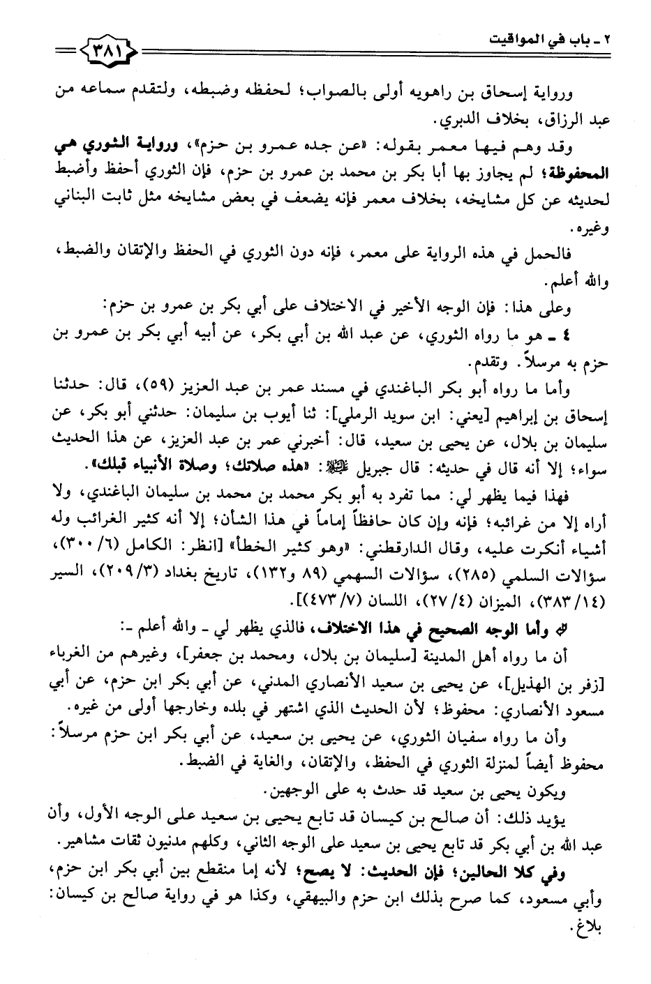وأن ما رواه سفيان الثوري، عن يحيى بن سعيد، عن أبي بكر بن حزم مرسلًا: محفوظ أيضًا لمنزلة الثوري في الحفظ، والإتقان، والغاية في الضبط.