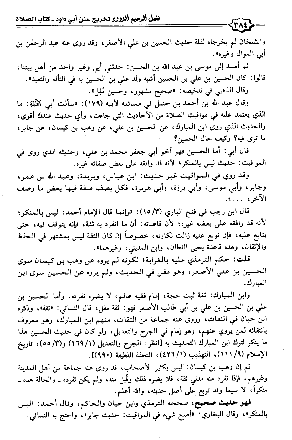 وقال عبد الله بن أحمد بن حنبل في مسائله لأبيه (١٧٩): "سألت أبي رحمه الله: ما الذي يعتمد عليه في مواقيت الصلاة من الأحاديث التي جاءت، وأي حديث عندك أقوى، والحديث الذي روى ابن المبارك، عن الحسين بن علي، عن وهب بن كيسان، عن جابر، ما ترى فيه؟ وكيف حال الحسين؟