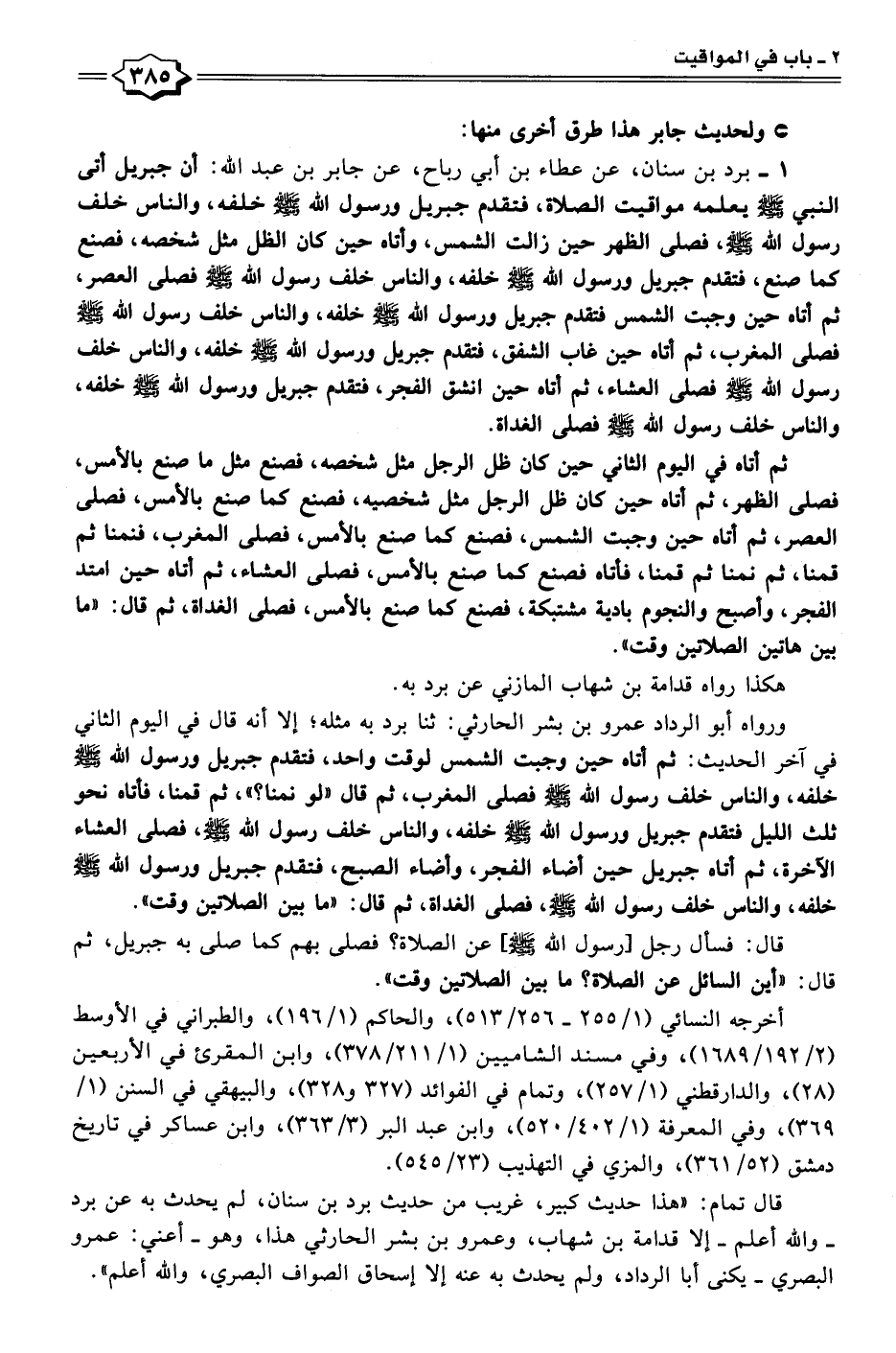 ١ - برد بن سنان، عن عطاء بن أبي رباح، عن جابر بن عبد الله: أن جبريل أتى النبي - صلى الله عليه وسلم - يعلمه مواقيت الصلاة، فتقدم جبريل ورسول الله - صلى الله عليه وسلم - خلفه، والناس خلف رسول الله - صلى الله عليه وسلم -، فصلى الظهر حين زالت الشمس، وأتاه حين كان الظل مثل شخصه، فصنع كما صنع، فتقدم جبريل ورسول الله - صلى الله عليه وسلم - خلفه، والناس خلف رسول الله - صلى الله عليه وسلم - فصلى العصر، ثم أتاه حين وجبت الشمس فتقدم جبريل ورسول الله - صلى الله عليه وسلم - خلفه، والناس خلف رسول الله - صلى الله عليه وسلم - فصلى المغرب، ثم أتاه حين غاب الشفق، فتقدم جبريل ورسول الله - صلى الله عليه وسلم - خلفه، والناس خلف رسول الله - صلى الله عليه وسلم - فصلى العشاء، ثم أتاه حين انشق الفجر، فتقدم جبريل ورسول الله - صلى الله عليه وسلم - خلفه، والناس خلف رسول الله - صلى الله عليه وسلم - فصلى الغداة.