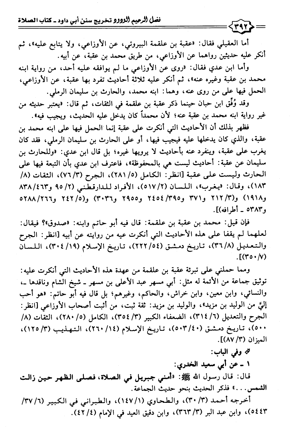فظهر بذلك أن الأحاديث التي أنكرت على عقبة إنما الحمل فيها على ابنه محمد بن عقبة، والذي كان يدخلها عليه فيجيب فيها، أو على الحارث بن سليمان الرملي، فقد كان يغرب على عقبة، وينفرد عنه بأحاديث لا يرويها غيره؛ بل قال ابن عدي: "وللحارث بن سليمان عن عقبة: أحاديث ليست هي بالمحفوظة"، فاعترف ابن عدي بأن التبعة فيها على الحارث وليست على عقبة [انظر: الكامل (٥/ ٢٨١)، الجرح (٣/ ٧٦)، الثقات (٨/ ١٨٣)، وقال: "يغرب"، اللسان (٢/ ٥١٧)، الأفراد للدارقطني (٢/ ٩٥ و ٤٦٣/ ٨٣٨ و ١٩١٨) و (٣/ ٢١٢ و ٣٧١ و ٣٩٥/ ٢٤٥٤ و ٢٩٥٥ و ٣٠٣٦) و (٥/ ٢٤٢ و ٢٦٦/ ٥٢٨٨ و ٥٣٨٣ - أطرافه)].