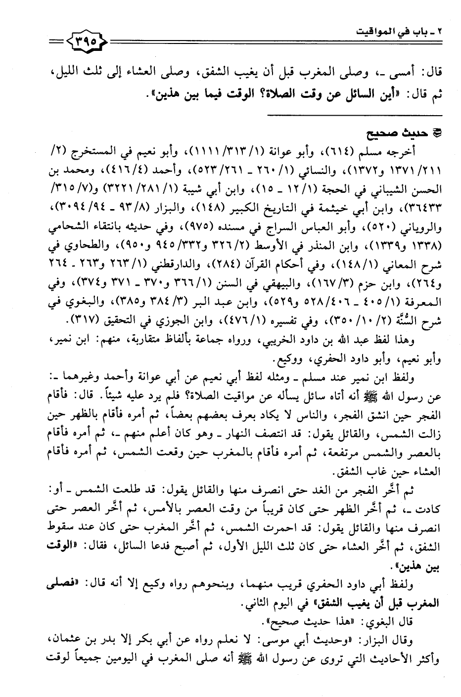 ولفظ ابن نمير عند مسلم -ومثله لفظ أبي نعيم عن أبي عوانة وأحمد وغيرهما-: عن رسول الله - صلى الله عليه وسلم - أنه أتاه سائل يسأله عن مواقيت الصلاة؟ فلم يرد عليه شيئًا. قال: فأقام الفجر حين انشق الفجر، والناس لا يكاد بعرف بعضهم بعضًا، ثم أمره فأقام بالظهر حين زالت الشمس، والقائل يقول: قد انتصف النهار -وهو كان أعلم منهم-، ثم أمره فأقام بالعصر والشمس مرتفعة، ثم أمره فأقام بالمغرب حين وقعت الشمس، ثم أمره فأقام العشاء حين غاب الشفق.