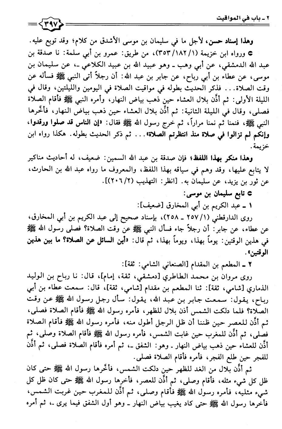 روى مروان بن محمد الطاطري [دمشقي، ثقة، إمام]، قال: نا رباح بن الوليد الذماري [شامي، ثقة]: ثنا المطعم بن مقدام [شامي، ثقة]، قال: سمعت عطاء بن أبي رباح، يقول: سمعت جابر بن عبد الله، يقول: سأل رجل رسول الله - صلى الله عليه وسلم - عن وقت الصلاة؟ فلما دلكت الشمس أذن بلال للظهر، فأمره رسول الله - صلى الله عليه وسلم - فأقام الصلاة فصلى، ثم أذَّن للعصر حين ظننا أن ظل الرجل أطول منه، فأمره رسول الله - صلى الله عليه وسلم - فأقام الصلاة فصلى، ثم أذَّن للمغرب حين غابت الشمس، فأمره رسول الله - صلى الله عليه وسلم - فأقام الصلاة وصلى، ثم أذن للعشاء حين ذهب بياض النهار -وهو: الشفق-، ثم أمره فأقام الصلاة فصلى، ثم أذن للفجر حين طلع الفجر، فأمره فأقام الصلاة فصلى.