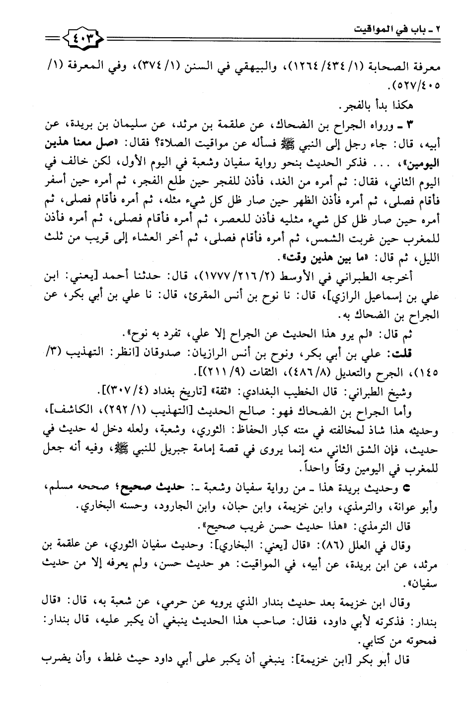 ٣ - ورواه الجراح بن الضحاك، عن علقمة بن مرثد، عن سليمان بن بريدة، عن أبيه، قال: جاء رجل إلى النبي - صلى الله عليه وسلم - فسأله عن مواقيت الصلاة؟ فقال: "صل معنا هذين اليومين"،. . . فذكر الحديث بنحو رواية سفيان وشعبة في اليوم الأول، لكن خالف في اليوم الثاني، فقال: ثم أمره من الغد، فأذن للفجر حين طلع الفجر، ثم أمره حين أسفر فأقام فصلى، ثم أمره فأذن الظهر حين صار ظل كل شيء مثله، ثم أمره فأقام فصلى، ثم أمره حين صار ظل كل شيء مثليه فأذن للعصر، ثم أمره فأقام فصلى، ثم أمره فأذن للمغرب حين غربت الشمس، ثم أمره فأقام فصلى، ثم آخر العشاء إلى قريب من ثلث الليل، ثم قال: "ما بين هذين وقت".