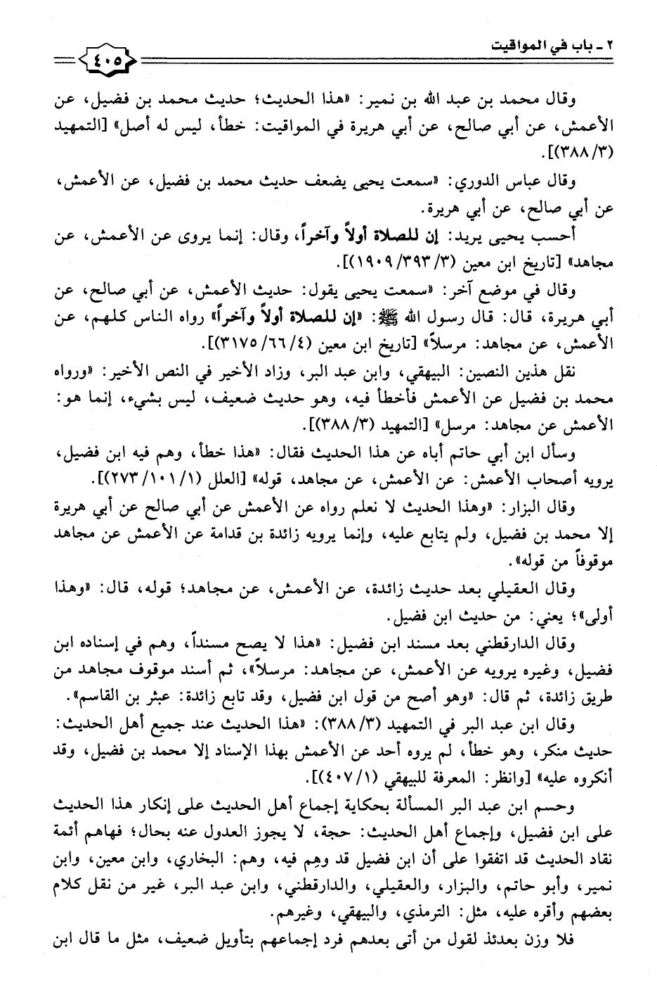 وقال محمد بن عبد الله بن نمير: "هذا الحديث؛ حديث محمد بن فضيل، عن الأعمش، عن أبي صالح، عن أبي هريرة في المواقيت: خطأ، ليس له أصل" [التمهيد (٣/ ٣٨٨)].