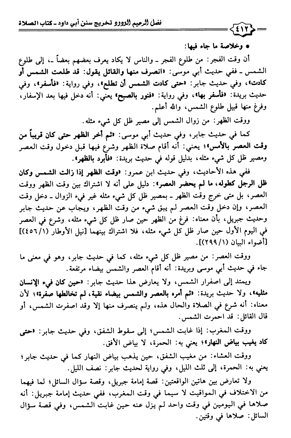 ففي هذه الأحاديث، وفي حديث ابن عمرو: "وقت الظهر إذا زالت الشمس وكان ظل الرجل كطوله، ما لم يحضر العصر": دليل على أنه لا اشتراك بين وقت الظهر ووقت العصر، بل متى خرج وقت الظهر -بمصير ظل كل شيء مثله غير فيء الزوال- دخل وقت العصر، وإن دخل وقت العصر لم يبق شيء من وقت الظهر، ويجاب عن حديث جابر وحديث جبريل، بأن معناه: فرغ من الظهر حين صار ظل كل شيء مثله، وشرع في العصر في اليوم الأول حين صار ظل كل شيء مثله، فلا اشتراك بينهما [نيل الأوطار (١/ ٤٥٦)] [أضواء البيان (١/ ٢٩٩)].
