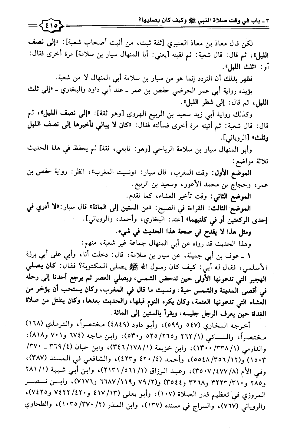 ١ - عوف بن أبي جميلة، عن سيار بن سلامة، قال: دخلت أنا، وأبي على أبي برزة الأسلمي، فقال له أبي: كيف كان رسول الله - صلى الله عليه وسلم - يصلي المكتوبة؟ فقال: كان يصلي الهجير التي تدعونها الأولى حين تدحض الشمس، ويصلي العصر ثم يرجع أحدنا إلى رحله في أقصى المدينة والشمس حية، ونسيت ما قال في المغرب، وكان يستحب أن يؤخر من العشاء التي تدعونها العتمة، وكان يكره النوم قبلها، والحديث بعدها، وكان ينفتل من صلاة الغداة حين يعرف الرجل جليسه، ويقرأ بالستين إلى المائة.