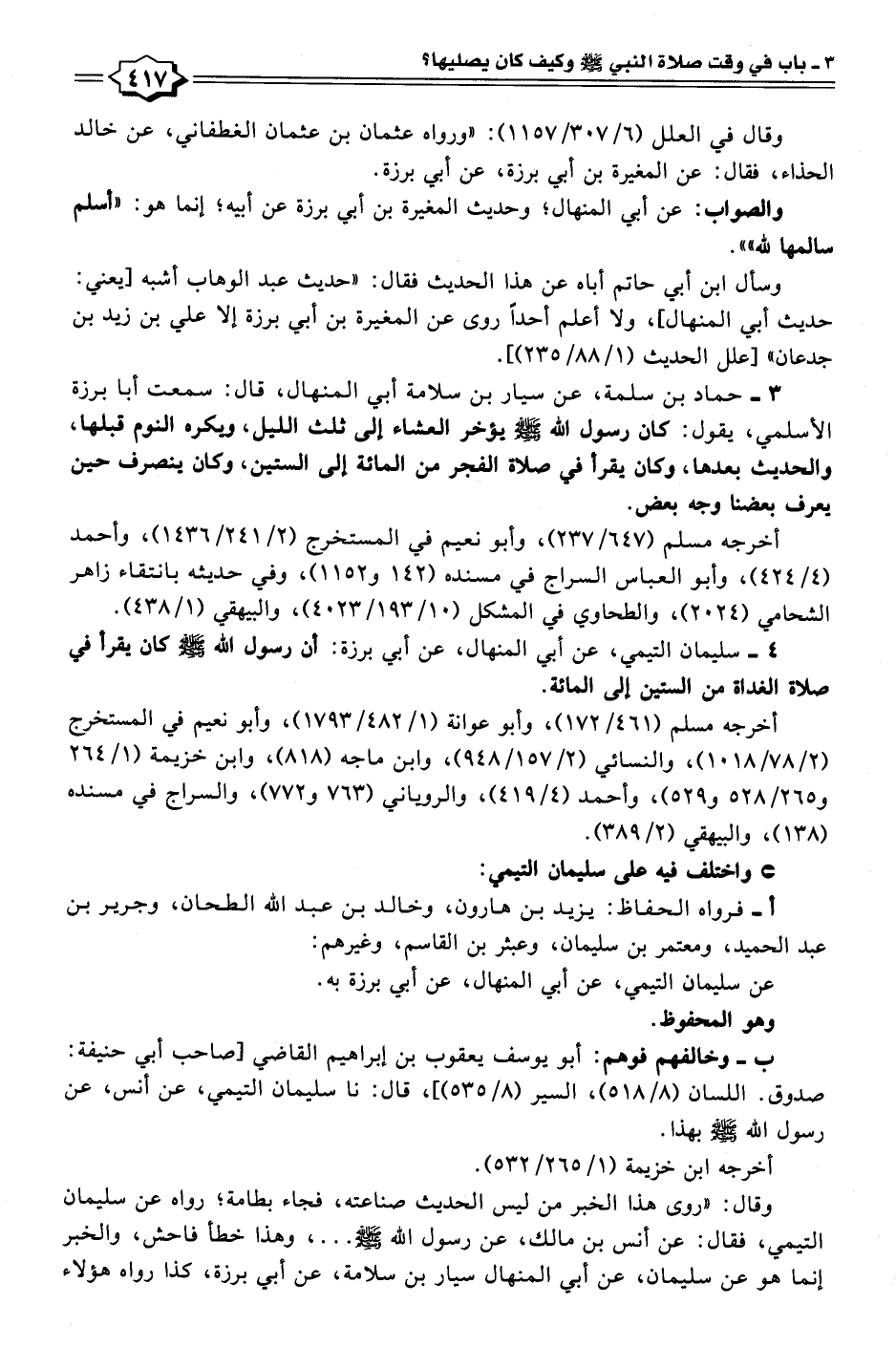 وقال: "روى هذا الخبر من ليس الحديث صناعته، فجاء بطامة؛ رواه عن سليمان التيمي، فقال: عن أنس بن مالك، عن رسول الله - صلى الله عليه وسلم -. . .، وهذا خطأ فاحش، والخبر إنما هو عن سليمان، عن أبي المنهال سيار بن سلامة، عن أبي برزة، كذا رواه هؤلاء