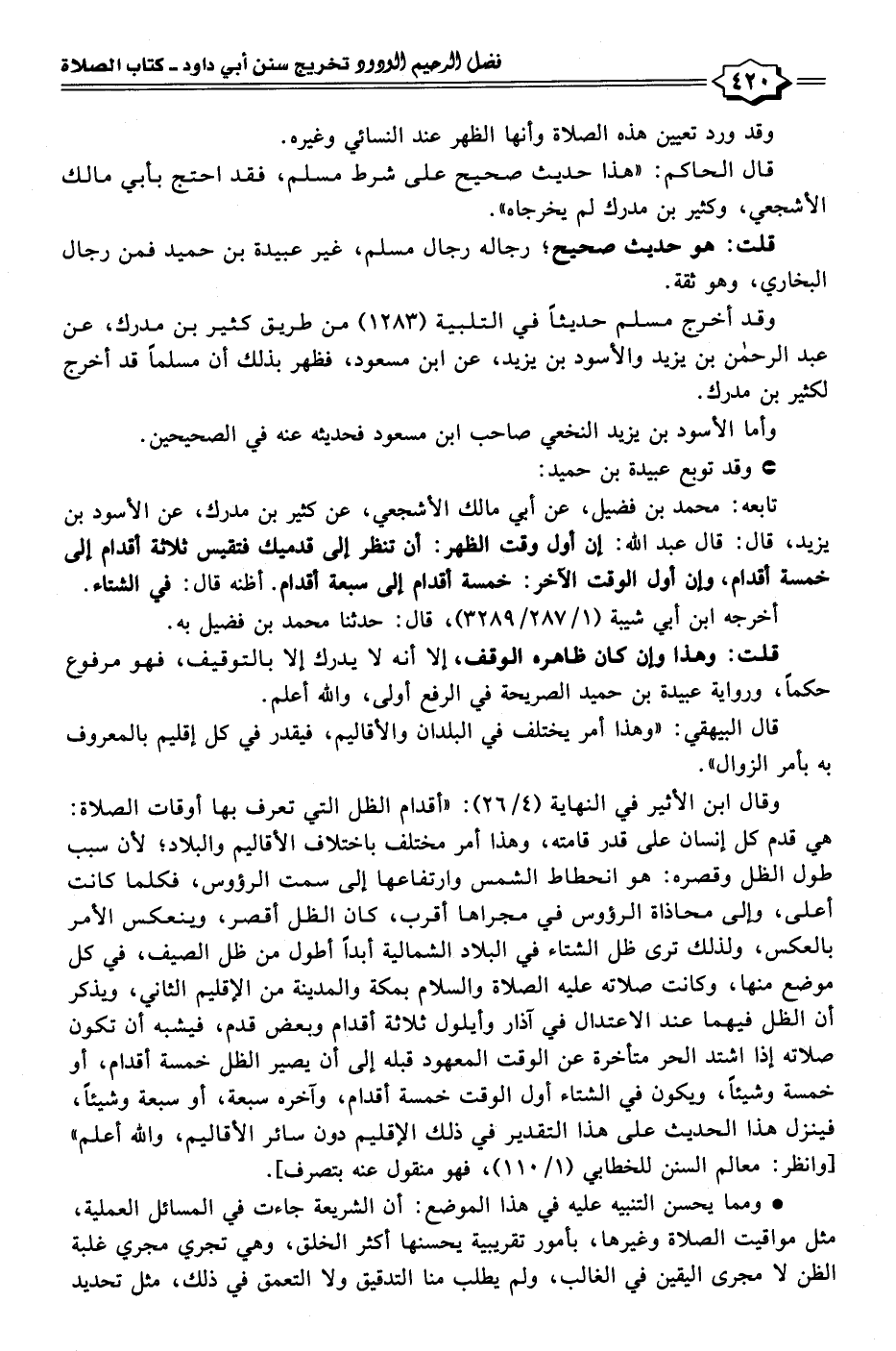 وقال ابن الأثير في النهاية (٤/ ٢٦): "أقدام الظل التي تعرف بها أوقات الصلاة: هي قدم كل إنسان على قدر قامته، وهذا أمر مختلف باختلاف الأقاليم والبلاد؛ لأن سبب طول الظل وقصره: هو انحطاط الشمس وارتفاعها إلى سمت الرؤوس، فكلما كانت أعلى، وإلى محاذاة الرؤوس في مجراها أقرب، كان الظل أقصر، وينعكس الأمر بالعكس، ولذلك ترى ظل الشتاء في البلاد الشمالية أبدًا أطول من ظل الصيف، في كل موضع منها، وكانت صلاته عليه الصلاة والسلام بمكة والمدينة من الأقليم الثاني، ويذكر أن الظل فيهما عند الاعتدال في آذار وأيلول ثلاثة أقدام وبعض قدم، فيشبه أن تكون صلاته إذا اشتد الحر متأخرة عن الوقت المعهود قبله إلى أن يصير الظل خمسة أقدام، أو خمسة وشيئًا، ويكون في الشتاء أول الوقت خمسة أقدام، وآخره سبعة، أو سبعة وشيئًا، فينزل هذا الحديث على هذا التقدير في ذلك الأقليم دون سائر الأقاليم، والله أعلم" [وانظر: معالم السنن للخطابي (١/ ١١٠)، فهو منقول عنه بتصرف].