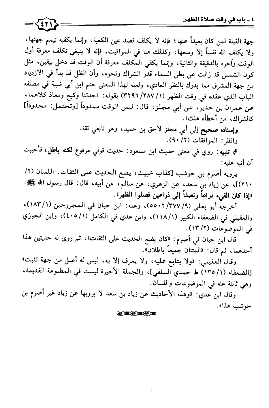 جهة القبلة لمن كان بعيدًا عنها؛ فإنه لا يكلف قصد عين الكعبة، وإنما يكفيه تيمم جهتها، ولا يكلف الله نفسًا إلا وسعها، وكذلك هنا في المواقيت، فإنه لا ينبغي تكلف معرفة أول الوقت وآخره بالدقيقة والثانية، وإنما يكفي المكلف معرفة أن الوقت قد دخل بيقين، مثل كون الشمس قد زالت عن بطن السماء قدر الشراك ونحوه، وأن الظل قد بدأ في الازدياد من جهة المشرق مما يدرك بالنظر العادي، ولعله لهذا المعنى ختم ابن أبي شيبة في مصنفه الباب الذي عقده في وقت الظهر (١/ ٢٨٧/ ٣٢٩٦) بقوله: "حدثنا وكيع ومعاذ كلاهما، عن عمران بن حدير، عن أبي مجلز، قال: ليس الوقت ممدودًا [وتحتمل: محدودًا] كالشراك، من أخطأه هلك".