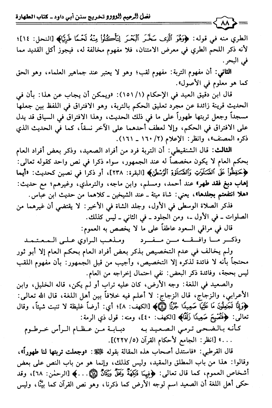 قال القرطبي: "فاستدل أصحاب هذه المقالة بقوله عليه السلام: "وجعلت تربتها لنا طهورًا"، وقالوا: هذا من باب المطلق والمقيد، وليس كذلك، وإنما هو من باب النص على بعض أشخاص العموم، كما قال تعالى: {فِيهِمَا فَاكِهَةٌ وَنَخْلٌ وَرُمَّانٌ (٦٨)} [الرحمن: ٦٨]، وقد حكى أهل اللغة أن الصعيد اسم لوجه الأرض كما ذكرنا، وهو نص القرآن كما بيَّنَّا، وليس