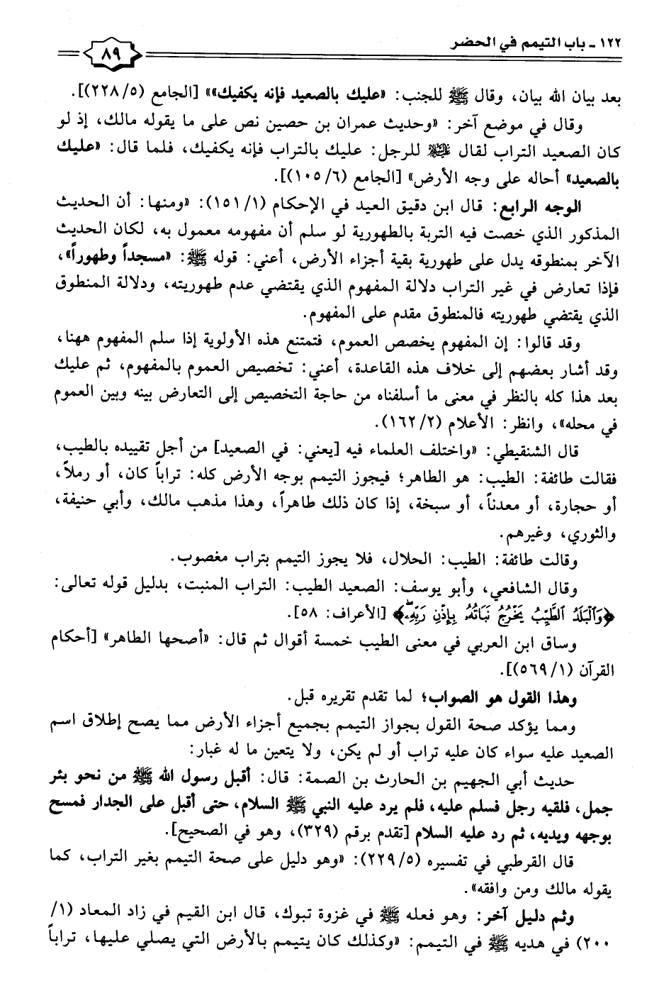 وقال في موضع آخر: "وحديث عمران بن حصين نص على ما يقوله مالك، إذ لو كان الصعيد التراب لقال عليه السلام للرجل: عليك بالتراب فإنه يكفيك، فلما قال: "عليك بالصعيد" أحاله على وجه الأرض" [الجامع (٦/ ١٠٥)].