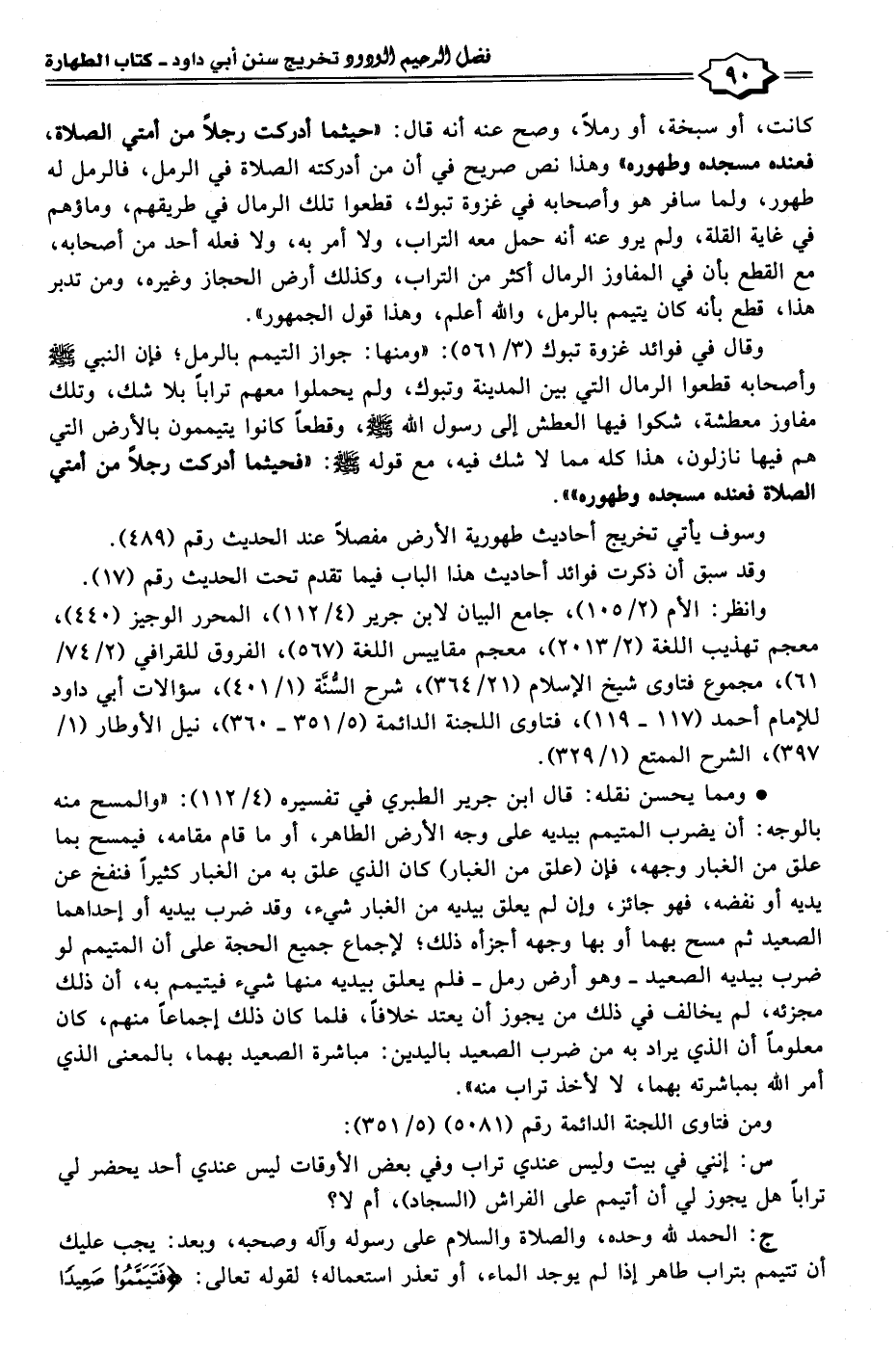 • ومما يحسن نقله: قال ابن جرير الطبري في تفسيره (٤/ ١١٢): "والمسح منه بالوجه: أن يضرب المتيمم بيديه على وجه الأرض الطاهر، أو ما قام مقامه، فيمسح بما علق من الغبار وجهه، فإن (علق من الغبار) كان الذي علق به من الغبار كثيرًا فنفخ عن يديه أو نفضه، فهو جائز، وإن لم يعلق بيديه من الغبار شيء، وقد ضرب بيديه أو إحداهما الصعيد ثم مسح بهما أو بها وجهه أجزأه ذلك؛ لإجماع جميع الحجة على أن المتيمم لو ضرب بيديه الصعيد -وهو أرض رمل- فلم يعلق بيديه منها شيء فيتيمم به، أن ذلك مجزئه، لم يخالف في ذلك من يجوز أن يعتد خلافًا، فلما كان ذلك إجماعًا منهم، كان معلومًا أن الذي يراد به من ضرب الصعيد باليدين: مباشرة الصعيد بهما، بالمعنى الذي أمر الله بمباشرته بهما، لا لأخذ تراب منه"