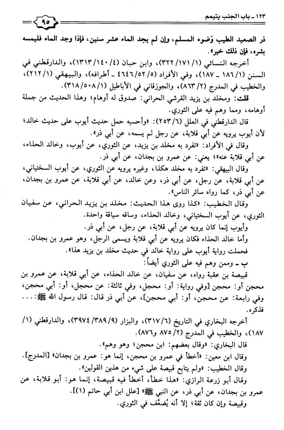 وقال البيهقي: "تفرد به مخلد هكذا، وغيره يرويه عن الثوري، عن أيوب السختياني، عن أبي قلابة، عن رجل، عن أبي ذر، وعن خالد، عن أبي قلابة، عن عمرو بن بجدان، عن أبي ذر، كما رواه سائر الناس".
