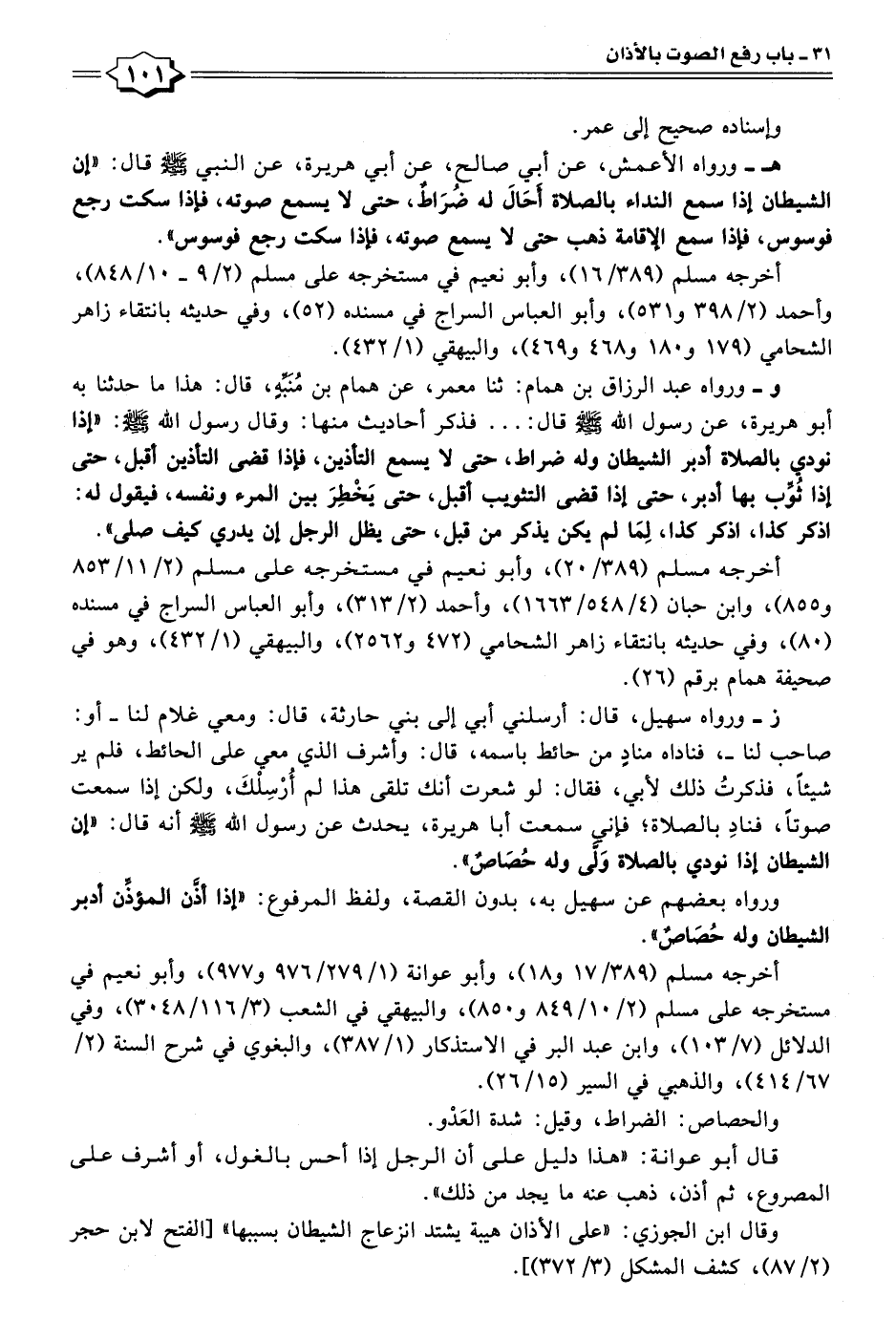 ز- ورواه سهيل، قال: أرسلني أبي إلى بني حارثة، قال: ومعي غلام لنا -أو: صاحب لنا-، فناداه منادٍ من حائط باسمه، قال: وأشرف الذي معي على الحائط، فلم ير شيئًا، فذكرتُ ذلك لأبي، فقال: لو شعرت أنك تلقى هذا لم أُرْسِلْكَ، ولكن إذا سمعت صوتًا، فنادِ بالصلاة؛ فإني سمعت أبا هريرة، يحدث عن رسول الله - صلى الله عليه وسلم - أنه قال: "إن الشيطان إذا نودي بالصلاة وَلَّى وله حُصَاصٌ".