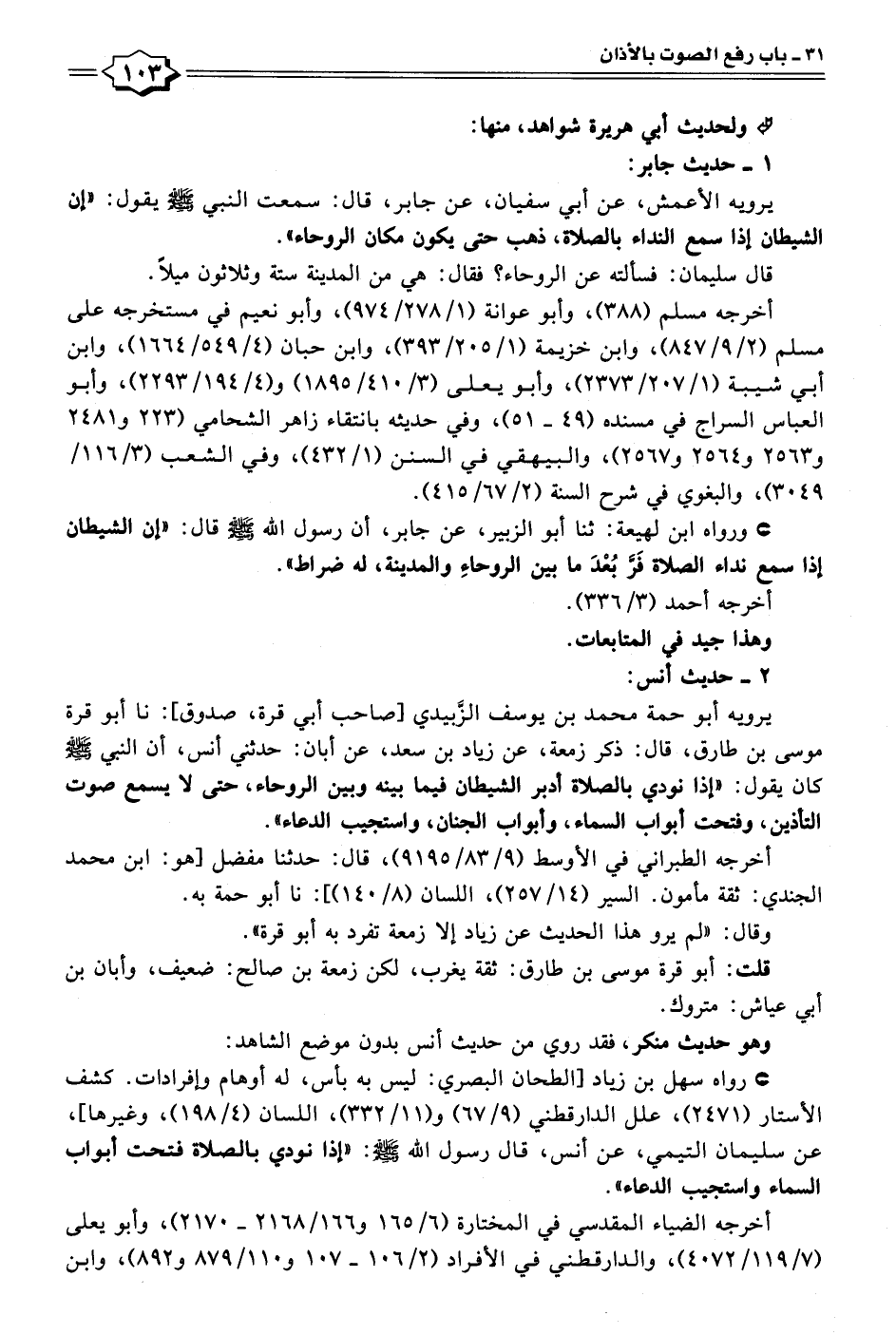 • ورواه ابن لهيعة: ثنا أبو الزبير، عن جابر، أن رسول الله - صلى الله عليه وسلم - قال: "إن الشيطان إذا سمع نداء الصلاة فَرَّ بُعْدَ ما بين الروحاءِ والمدينة، له ضراط".