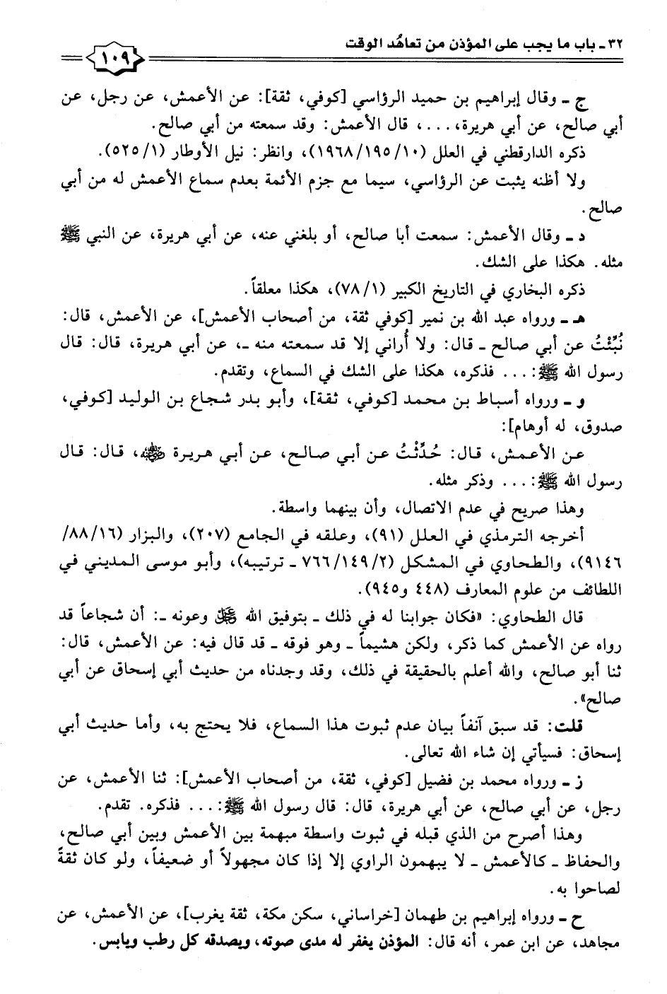 ح- ورواه إبراهيم بن طهمان [خراساني، سكن مكة، ثقة يغرب]، عن الأعمش، عن مجاهد، عن ابن عمر، أنه قال: المؤذن يغفر له مدى صوته، ويصدقه كل رطب ويابس.