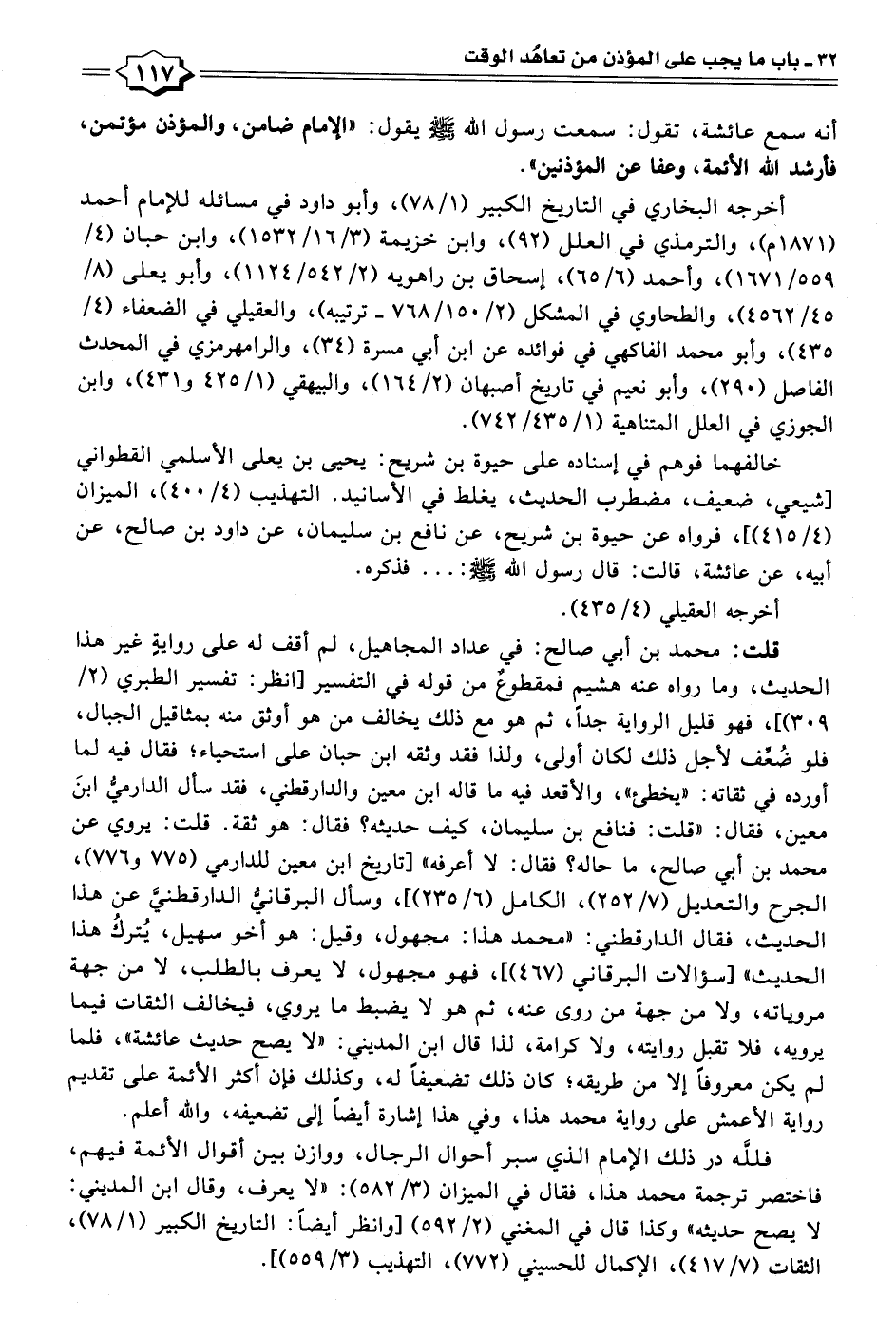 أخرجه البخاري في التاريخ الكبير (١/ ٧٨)، وأبو داود في مسائله للإمام أحمد (١٨٧١ م)، والترمذي في العلل (٩٢)، وابن خزيمة (٣/ ١٦/ ١٥٣٢)، وابن حبان (٤/ ٥٥٩/ ١٦٧١)، وأحمد (٦/ ٦٥)، إسحاق بن راهويه (٢/ ٥٤٢/ ١١٢٤)، وأبو يعلى (٨/ ٤٥/ ٤٥٦٢)، والطحاوي في المشكل (٢/ ١٥٠/ ٧٦٨ - ترتيبه)، والعقيلي في الضعفاء (٤/ ٤٣٥)، وأبو محمد الفاكهي في فوائده عن ابن أبي مسرة (٣٤)، والرامهرمزي في المحدث الفاصل (٢٩٠)، وأبو نعيم في تاريخ أصبهان (٢/ ١٦٤)، والبيهقي (١/ ٤٢٥ و ٤٣١)، وابن الجوزي في العلل المتناهية (١/ ٤٣٥/ ٧٤٢).