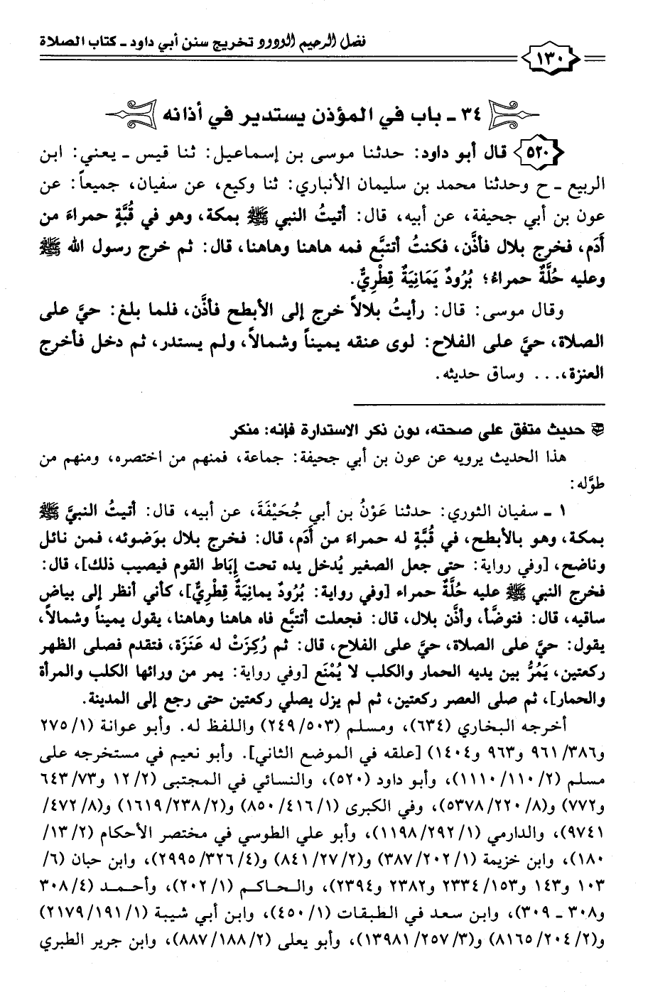 ٥٢٠ - قال أبو داود: حدثنا موسى بن إسماعيل: ثنا قيس -يعني: ابن الربيع- ح وحدثنا محمد بن سليمان الأنباري: ثنا وكيع، عن سفيان، جميعًا: عن عون بن أبي جحيفة، عن أبيه، قال: أتيتُ النبي - صلى الله عليه وسلم - بمكة، وهو في قُبَّةٍ حمراءَ من أَدَم، فخرج بلال فأذَّن، فكنتُ أتتبَّع فمه هاهنا وهاهنا، قال: ثم خرج رسول الله - صلى الله عليه وسلم - وعليه حُلَّةٌ حمراءُ؛ بُرُودٌ يَمَانِيَةٌ قِطْرِيٌّ.