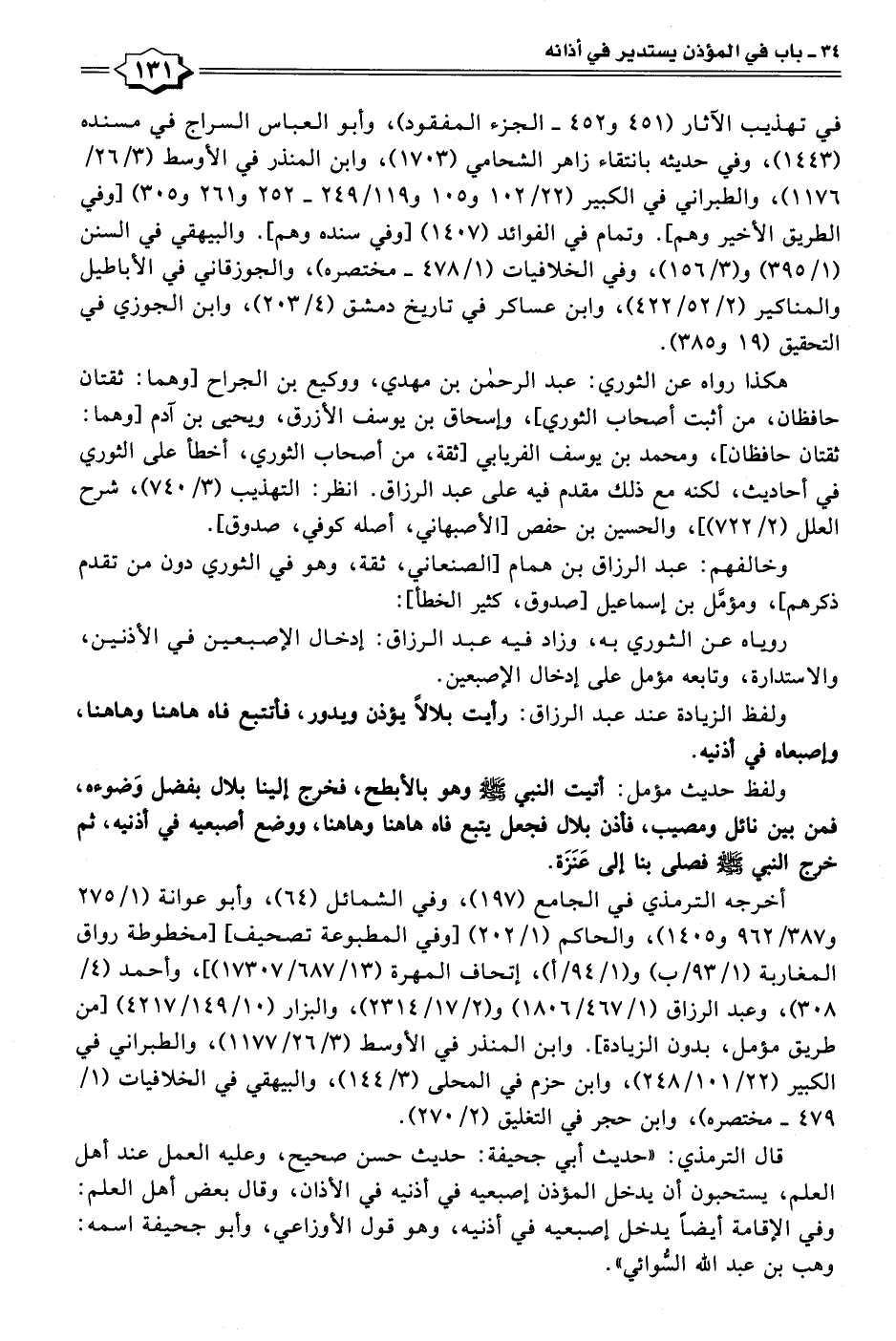 ولفظ الزيادة عند عبد الرزاق: رأيت بلالًا يؤذن ويدور، فأتتبع فاه هاهنا وهاهنا، وإصبعاه في أذنيه.