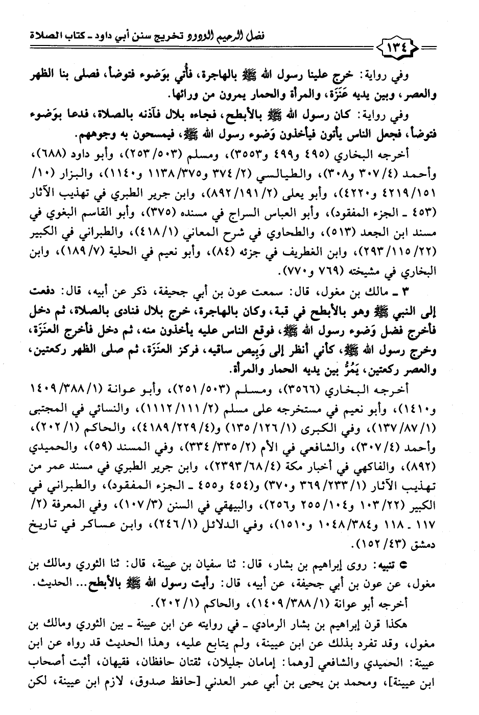 ٣ - مالك بن مغول، قال: سمعت عون بن أبي جحيفة، ذكر عن أبيه، قال: دفعت إلى النبي - صلى الله عليه وسلم - وهو بالأبطح في قبة، وكان بالهاجرة، خرج بلال فنادى بالصلاة، ثم دخل فأخرج فضل وَضوء رسول الله - صلى الله عليه وسلم -، فوقع الناس عليه يأخذون منه، ثم دخل فأخرج العنَزَة، وخرج رسول الله - صلى الله عليه وسلم -، كأني أنظر إلى وَبِيص ساقيه، فركز العنَزَة، ثم صلى الظهر ركعتين، والعصر ركعتين، يَمُرُّ بين يديه الحمار والمرأة.