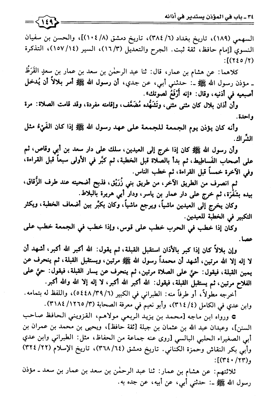 كلاهما: عن هشام بن عمار، قال: ثنا عبد الرحمن بن سعد بن عمار بن سعدٍ القَرَظُ - مؤذن رسول الله - صلى الله عليه وسلم - -: حدثني أبي، عن جدي، أن رسول الله - صلى الله عليه وسلم - أمر بلالًا أن يُدخل أصبعيه في أذنيه، وقال: "إنه أَرْفَعُ لصوتك".