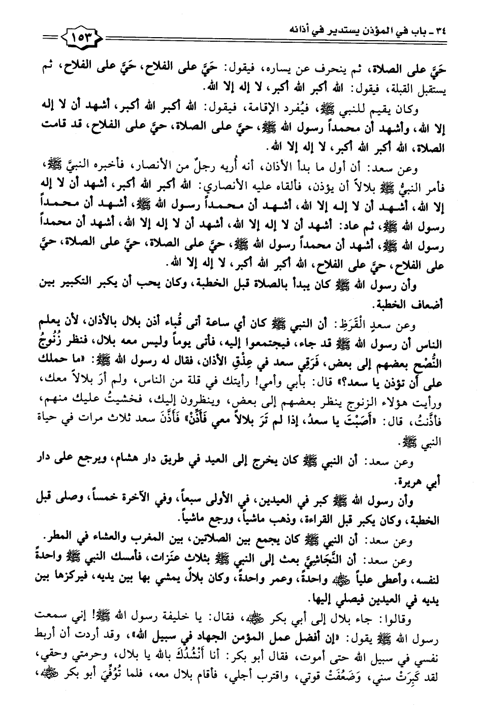وعن سعد: أن أول ما بدأ الأذان، أنَّه أُريه رجلٌ من الأنصار، فأخبره النبيَّ - صلى الله عليه وسلم -، فأمر النبي - صلى الله عليه وسلم - بلالًا أن يؤذن، فألقاه عليه الأنصاري: الله أكبر الله أكبر، أشهد أن لا إله إلا الله، أشهد أن لا إله إلا الله، أشهد أن محمدًا رسول الله - صلى الله عليه وسلم -، أشهد أن محمدًا رسول الله - صلى الله عليه وسلم -، ثم عاد: أشهد أن لا إله إلا الله، أشهد أن لا إله إلا الله، أشهد أن محمدًا رسول الله - صلى الله عليه وسلم -، أشهد أن محمدًا رسول الله - صلى الله عليه وسلم -، حيَّ على الصلاة، حيَّ على الصلاة، حيَّ على الفلاح، حيَّ على الفلاح، الله أكبر الله أكبر، لا إله إلا الله.