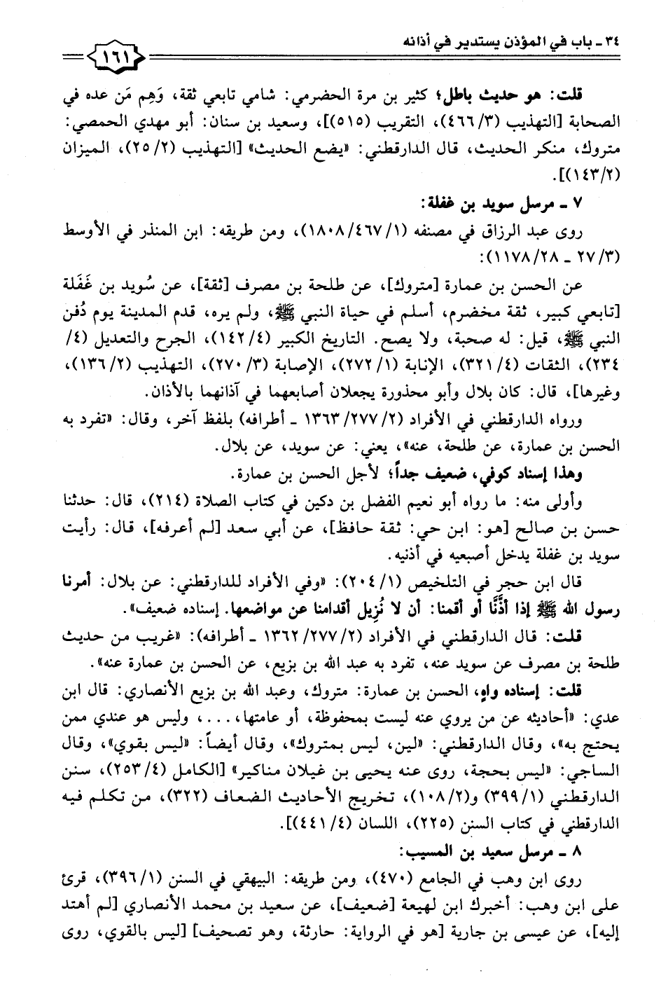 عن الحسن بن عمارة [متروك]، عن طلحة بن مصرف [ثقة]، عن سُويد بن غَفَلة [تابعي كبير، ثقة مخضرم، أسلم في حياة النبي - صلى الله عليه وسلم -، ولم يره، قدم المدينة يوم دُفن النبي - صلى الله عليه وسلم -، قيل: له صحبة، ولا يصح. التاريخ الكبير (٤/ ١٤٢)، الجرح والتعديل (٤/ ٢٣٤)، الثقات (٤/ ٣٢١)، الإنابة (١/ ٢٧٢)، الإصابة (٣/ ٢٧٠)، التهذيب (٢/ ١٣٦)، وغيرها]، قال: كان بلال وأبو محذورة يجعلان أصابعهما في آذانهما بالأذان.