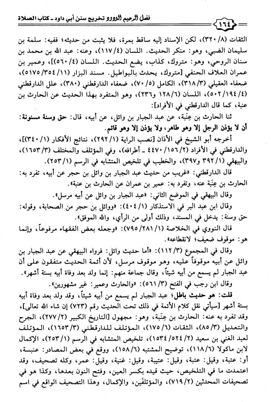 قال الدارقطني: "غريب من حديث عبد الجبار بن وائل بن حجر عن أبيه، تفرد به: الحارث بن عِنَبة عنه، وتفرد به: عمير بن عمران عن الحارث بن عنبة".